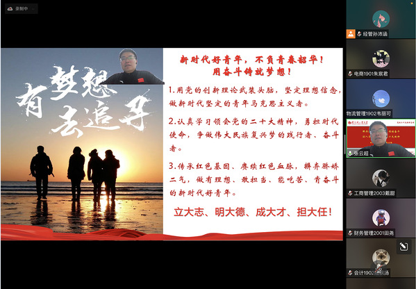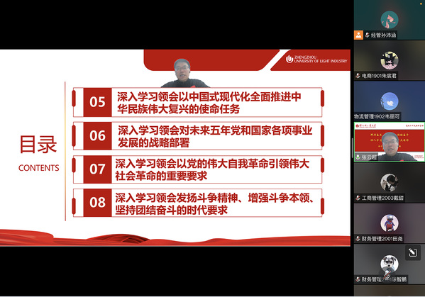 为深入学习宣传贯彻党的二十大精神,引导青年学生感悟思想伟力、汲取奋进力量、担当时代使命,12月4日晚,经济与管理学院党委书记张云超以《踔厉奋发勇毅前行团结奋斗——深入学习领会党的二十大精神》为题给学生讲专题思政课。学院部分辅导员和第14期发展对象培训班学员70余人参加线上学习。