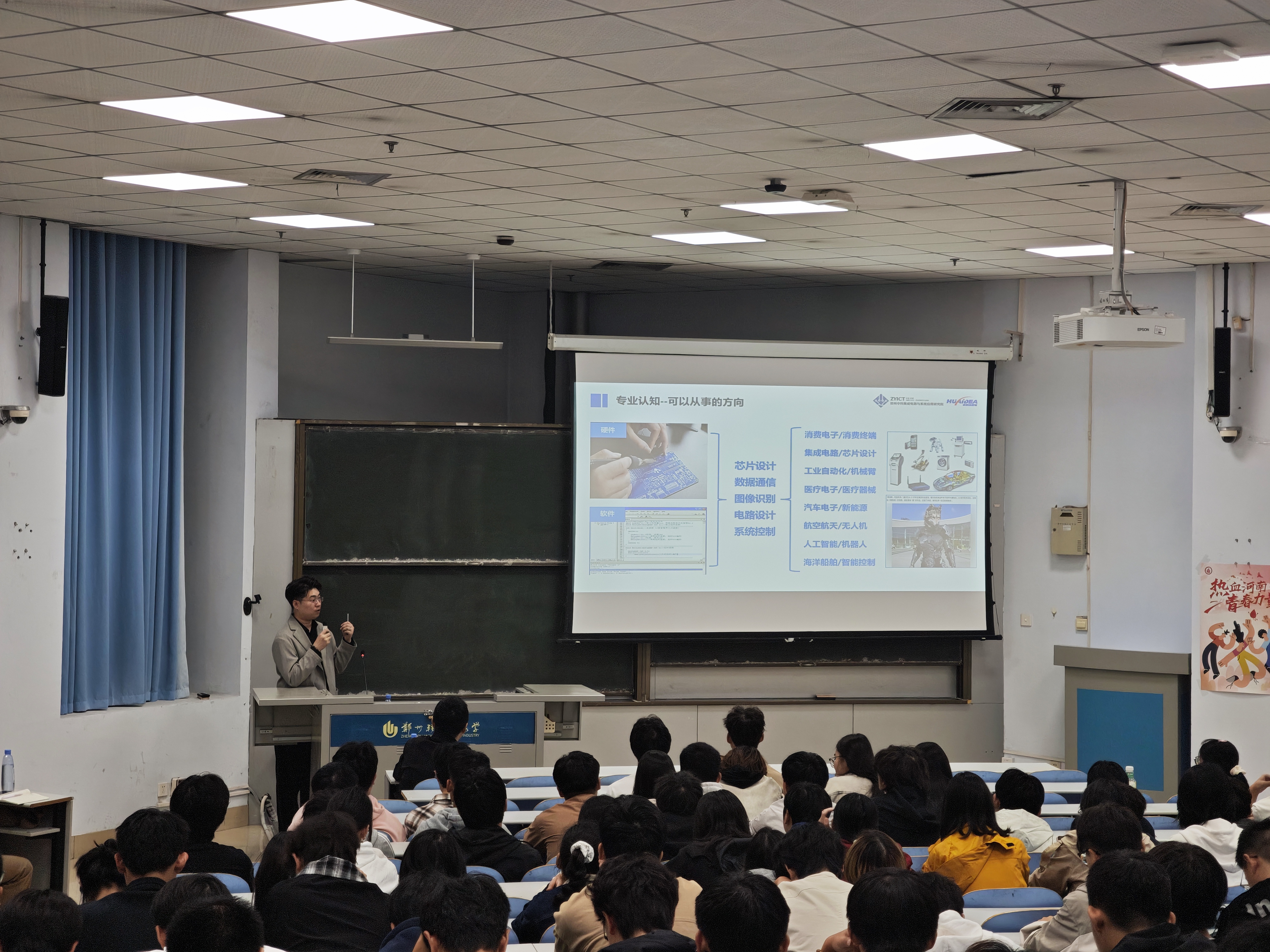 为助力2025级新生了解电子信息行业发展趋势,明确专业学习方向与职业规划,10月16日,电子信息学院在教三楼203教室举办“‘芯’辰大海·启航未来”新生入学企业专家讲座。本次讲座特邀郑州中科集成电路与系统应用研究院校企合作总监白杰、高级工程师胡修太担任主讲嘉宾,学院副院长冯学超、相关专业教师及2025级全体新生参加活动。