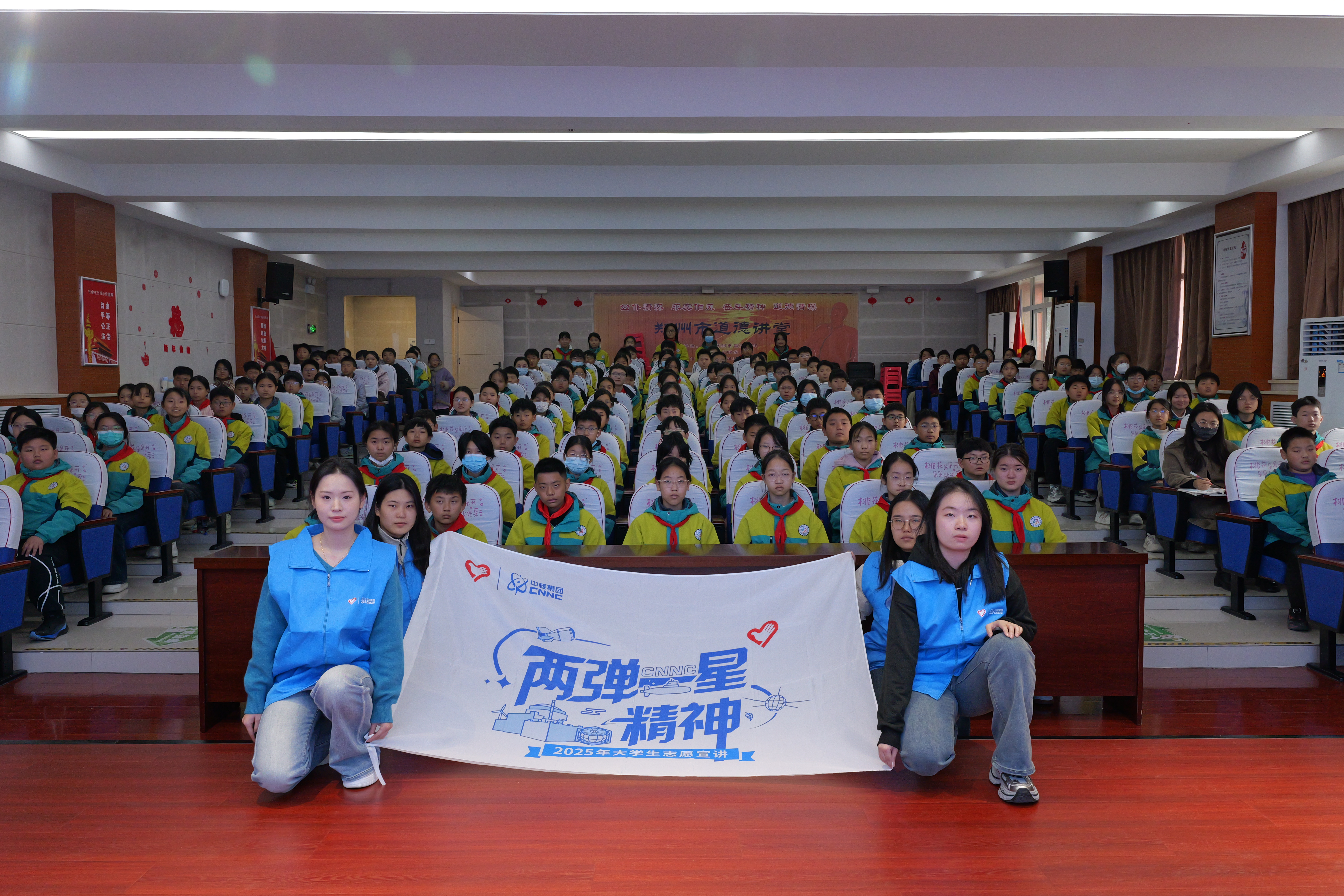 为深入推进“两弹一星”精神进校园、进课堂,2025年11月25日,软件学院青衿传炬志愿宣讲团走进郑州市高新区科学大道第二小学,为百余名师生带来了一场别开生面的“核工业启蒙”宣讲。此次宣讲以“启发式提问、互动化参与、强情感共鸣”的模式,引导少年学子们感受科技魅力,树立远大理想。
