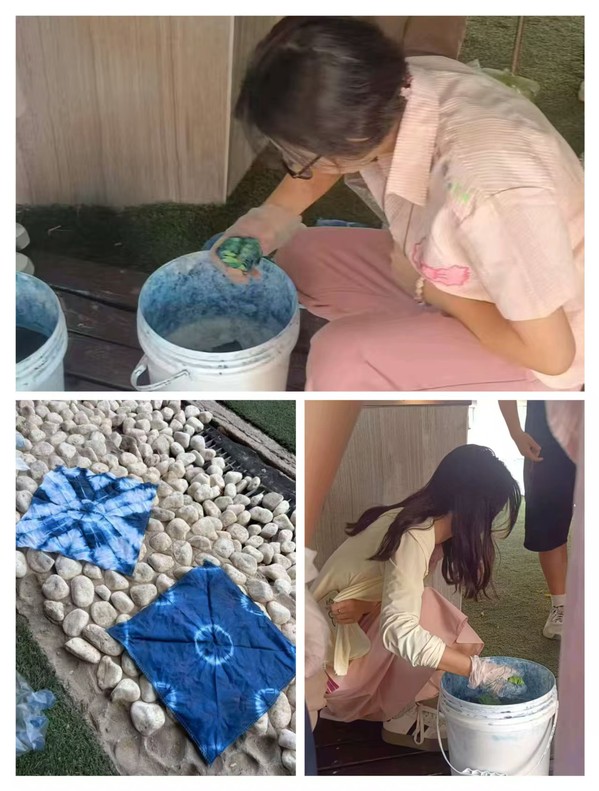 在扎染体验环节中,同学们在蒲公英使者的指导下,学习了传统扎染技艺。通过折叠、捆扎、浸染等工序,每位同学都创作出了独一无二的扎染作品。作为承载着千年民间智慧的非遗工艺,扎染体验不仅是一次手工创作,更是一场文化与心灵的深度对话。在慢节奏的手工实践中,暂时脱离学业的紧绷状态,获得心灵的沉静与放松,实现艺术疗愈的效果。更重要的是,这一过程让非遗文化不再局限于书本与展览,而是转化为可触摸、可创造的实践体验,助力非遗文化在校园中的传承与活化,增强学生对传统文化的认同感与自豪感。