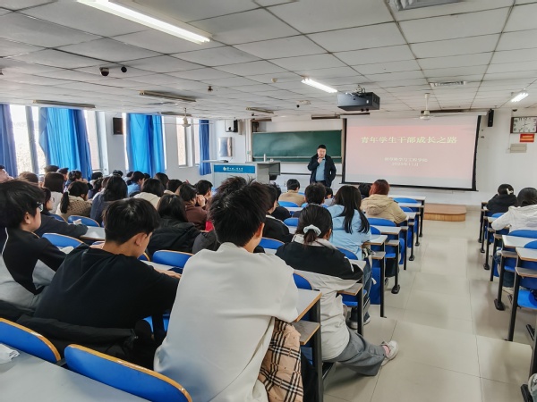 授课伊始,安小宇代表学院向长期以来辛勤付出、默默奉献的学生干部们表示衷心感谢,并充分肯定他们在服务同学、建设集体、推动学院发展中所发挥的重要作用。随后,安小宇结合党史、新中国史、改革开放史、社会主义发展史,从理想信念、道德修养、能力提升和责任担当四个维度,系统阐述了新时代青年学生干部的成长路径。一是要坚定理想信念,筑牢思想根基。作为学生群体中的“关键少数”,学生干部应始终强化事业心与责任感,坚守“服务同学、奉献集体”的初心使命;二是要坚持原则底线,涵养高尚品格。秉持以“德”为先,常怀敬畏之心、律己之心、感恩之心,严于修身、慎独慎微,在言谈举止上作表率、树标杆;三是要勤于学习实践,全面提升素质。既要学好课堂里的知识,也要用心读好社会这本大书,在实践中锤炼本领,不断增强组织协调、沟通表达和解决问题的能力;四是要勇于开拓创新,争当先锋模范。积极践行“为之则易,不为则难”的校训精神,以朴实的作风、务实的态度和扎实的能力,带动班风学风建设,助力学院高质量发展。