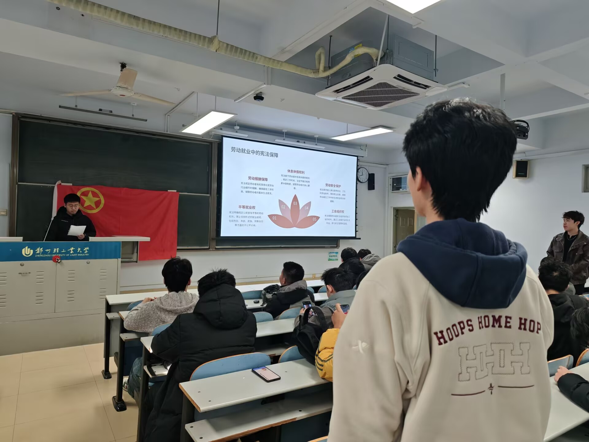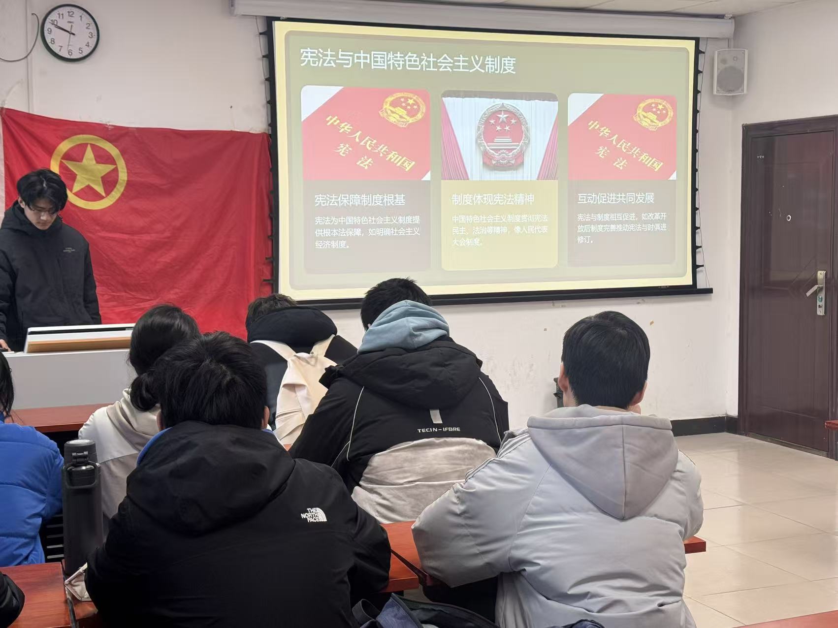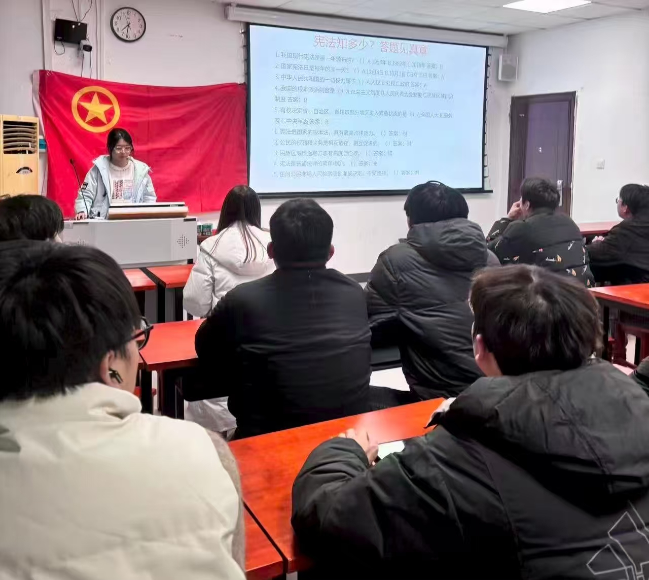 活动中,在各班团支书的带领下,同学们通过PPT讲解、视频播放等多种形式,对宪法的历史沿革、核心要义、实施现状等进行了深入学习,并结合日常生活、热点案例等对宪法与青年成长的价值关联,宪法在衣食住行、权益维护等日常场景中的实践意义等进行了解读,进一步加深了同学们对宪法的内涵、宪法精神的理解。在“宪法知识微竞赛”环节中,同学们围绕宪法基本原则、公民权利义务等知识点进行抢答,充分调动同学们对宪法学习的积极性。