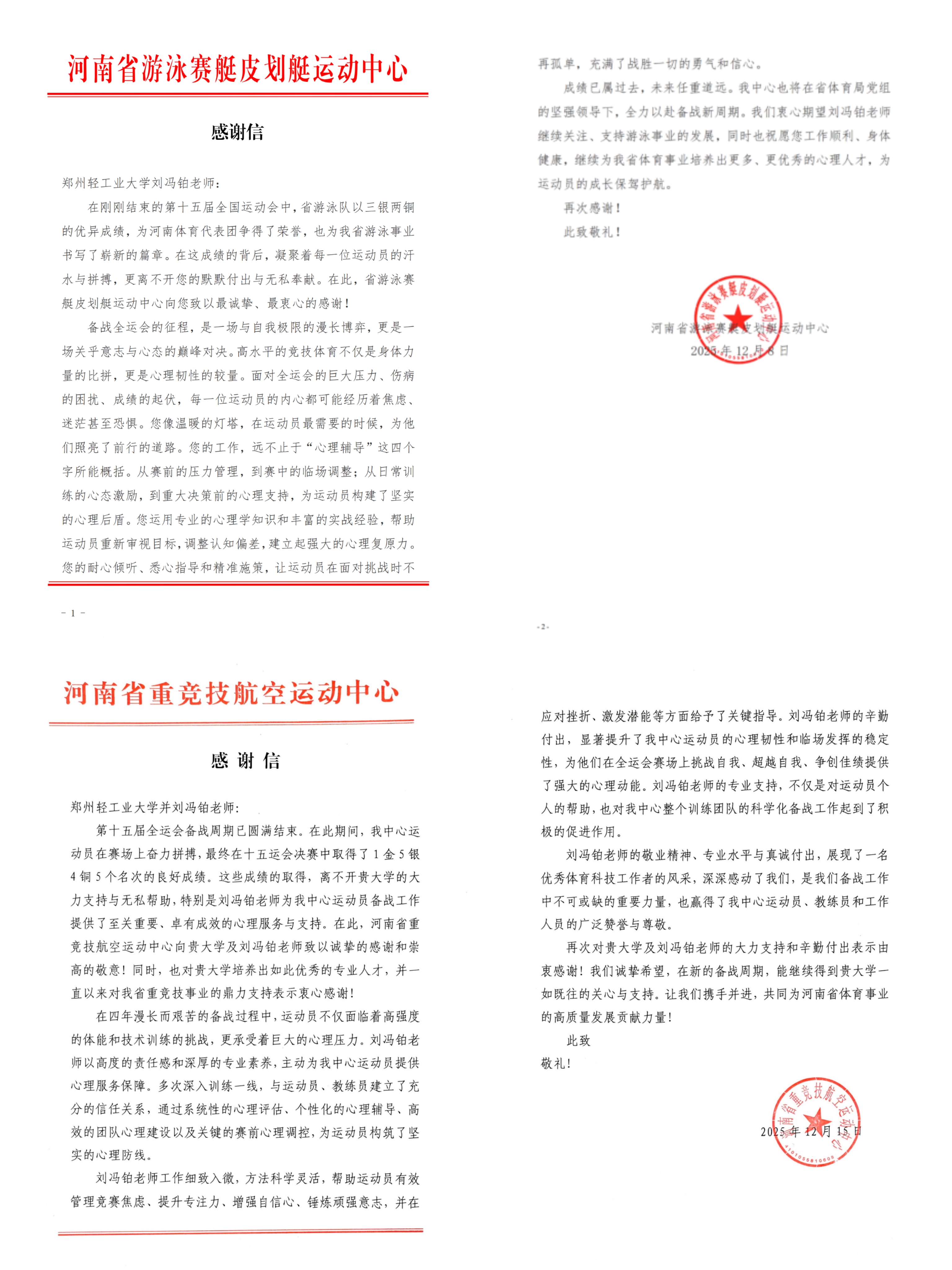 在刚刚结束的第十五届全国运动会中,河南体育代表团取得了骄人成绩。近日,体育学院教师刘冯铂接连收到河南省游泳赛艇皮划艇运动中心和河南省重技航空运动中心发来的感谢信。来信如下: