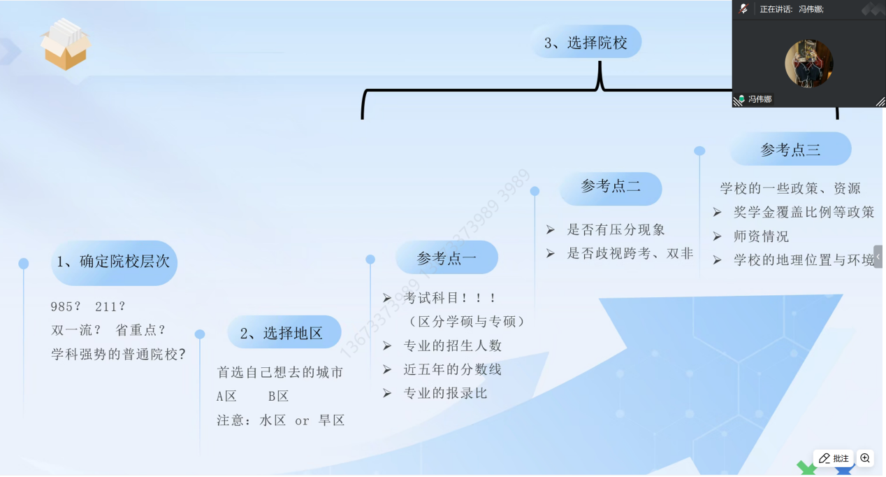 分享环节中,冯伟娜学姐首先从职业规划视角出发,客观对比了考研深造与直接就业的核心差异,引导同学们结合自身兴趣、职业目标与综合实力做出理性抉择。随后,她围绕考研关键环节展开详细拆解:在院校选择上,从院校层次、地区资源、专业实力等多个维度提供实用选择技巧;在备考规划上,针对数学、英语、政治及专业课的不同特点,明确各科目复习轮次、时间分配、优质资源筛选及高效复习频率,为学生搭建清晰的备考框架。​