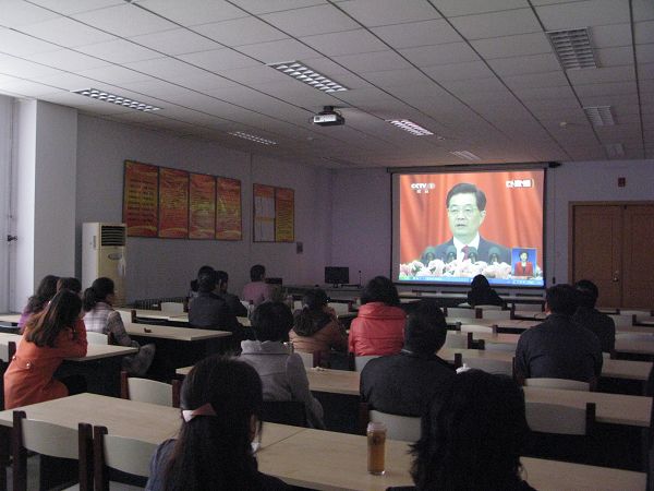 2012118上午9时,图书馆直属党支部组织图书馆、档案馆职工在图书馆六楼视频报告厅收看了十八大开幕式的盛况,认真聆听了胡锦涛总书记的报告。