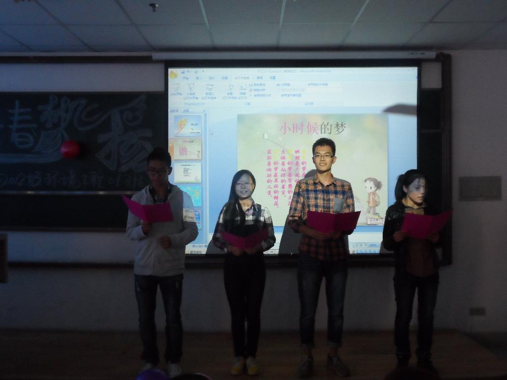 10月24日,环境工程2012级团支部在科学校区主教楼西塔710举办了“致青春,梦飞扬”的示范主题教育。活动伊始,主持人播放了微电影《田埂上的梦》,让同学们深深感受到,非凡的结果起始于非凡的梦想,不论身在何处,只要有梦想,只要我们为了梦想努力奋斗,都有实现梦想的那一天。当主持人让同学们谈谈自己小时候的梦想时,其中一位女学生说到情深处不禁哭了。接下来,激情的歌曲串烧、精彩的相声表演《怎样学习》、活力四射的舞蹈《日不落》,充分展示了该团支部积极向上、团结奋进的精神面貌。