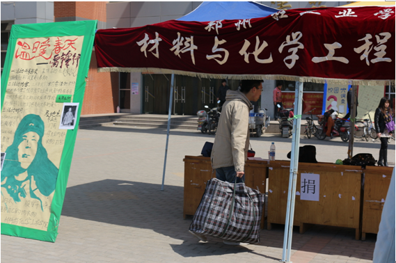 为弘扬雷锋精神,发扬团结互助、扶困济贫的中华民族传统美德,材料与化学工程学院于3月20日至21日在科学校区开展了“温暖春天——雷锋行”爱心捐赠活动。