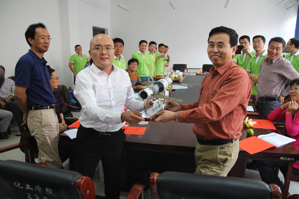 上午9点,校友们齐聚科学校区化工楼222会议室座谈。材料与化学工程学院党总支陶浩书记主持座谈会,方少明院长代表学院老师对2000级校友返校聚会表示热烈欢迎,并介绍了学院十年来的发展情况,并真诚邀请各位校友常回家看看。座谈会上,校友们分别介绍了自己毕业十年间的经历和自己的心路历程,大家分享了自己工作以来的体会和人生感悟。座谈会上,师生畅所欲言,气氛热烈。随后,校友们参观了河南省表界面科学重点实验室。2000级高分子专业校友向学院敬赠了潮绣(源远流长)和神舟十号对接天宫一号模型,表达了校友们对母校老师的感恩之情和美好祝愿。