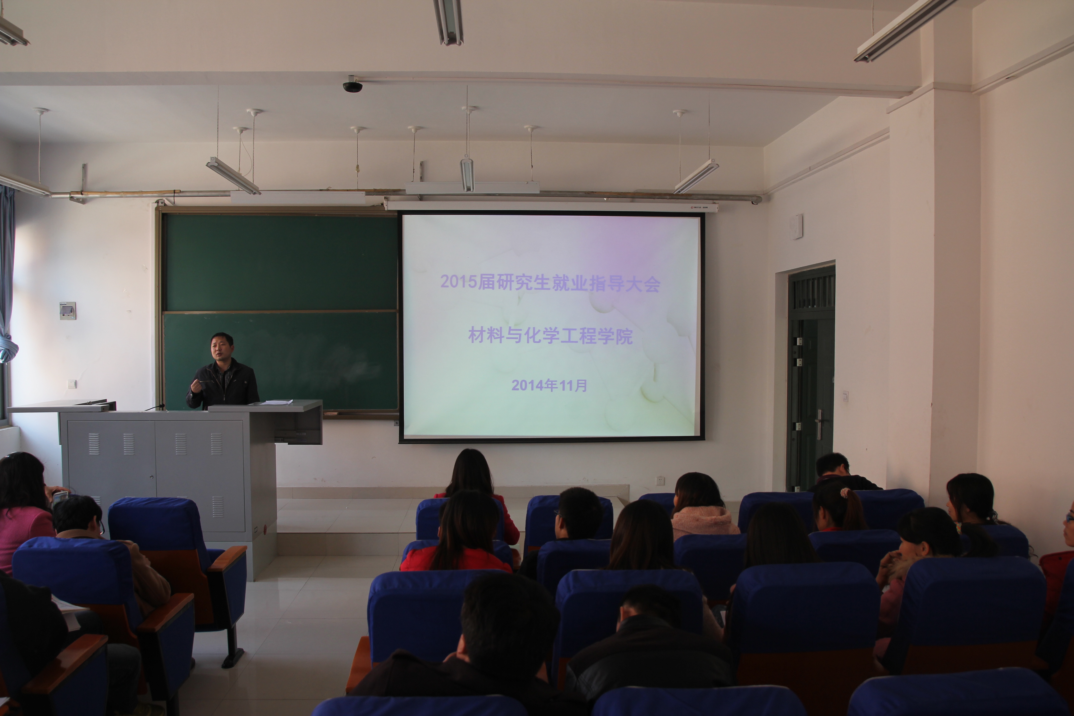 2014年11月13日下午,材料与化学工程学院在科学校区化工楼218召开了“2015届研究生就业指导大会”。学院党总支副书记宋德涛老师、研究生辅导员以及全体2015届研究生参加了此次大会。