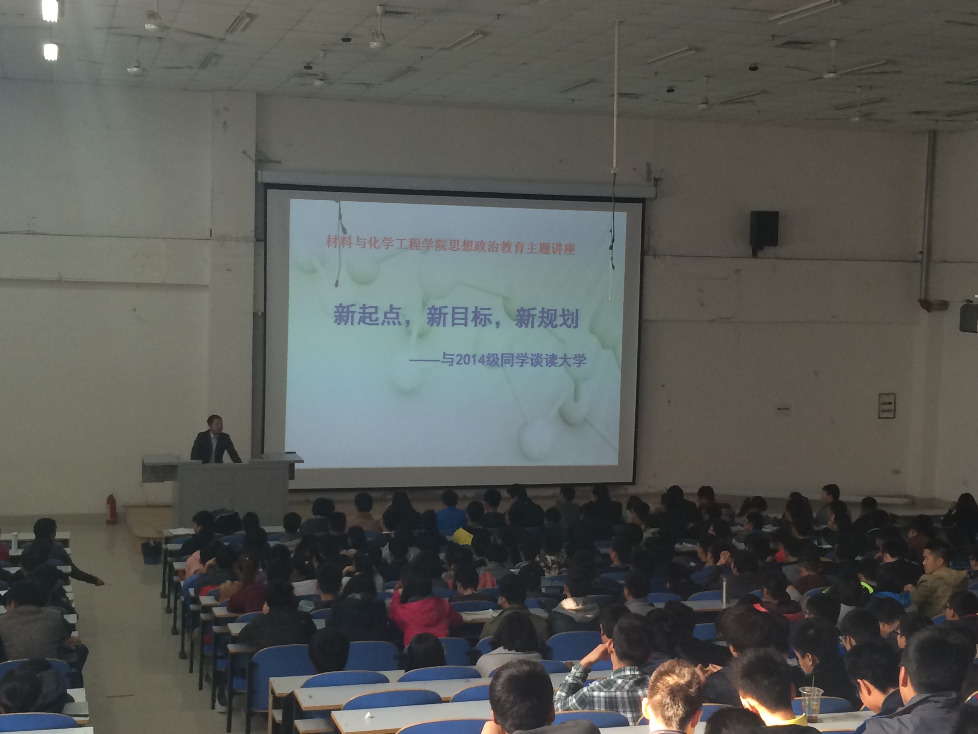 材料与化学工程学院于11月20日中午在科学校区三教楼408召开“新起点,新目标,新规划”主题学业规划指导大会。大会由学院党总支宋德涛副书记主讲,2014级新生辅导员及2014级全体学生参加了本次大会。
