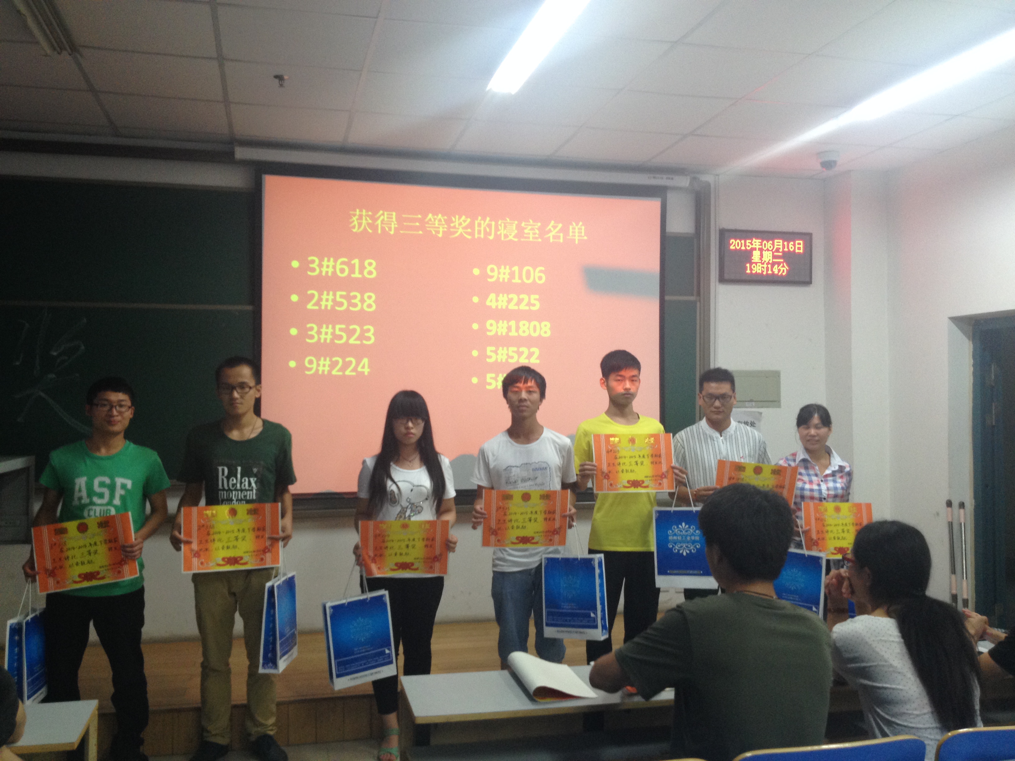 为进一步推进宿舍文化建设,丰富寝室文化内涵,促进同学们自觉营造整洁、舒适、健康的寝室环境,材料与化学工程学院在本学期开展了宿舍文化评比活动。2015年6月28 日在化工楼218召开了表彰大会。