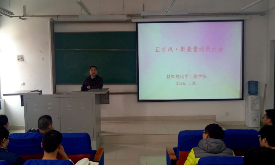 为了更好的贯彻落实学风建设有关文件精神,提高学风建设系列活动实效,营造学院全员参与学风建设的良好氛围,材料与化学工程学院于3月30日下午在化工楼218召开“正学风 聚能量”动员大会,学院党总支副书记宋德涛老师、分团委书记朱广正老师及全体学生干部参加了动员大会。
