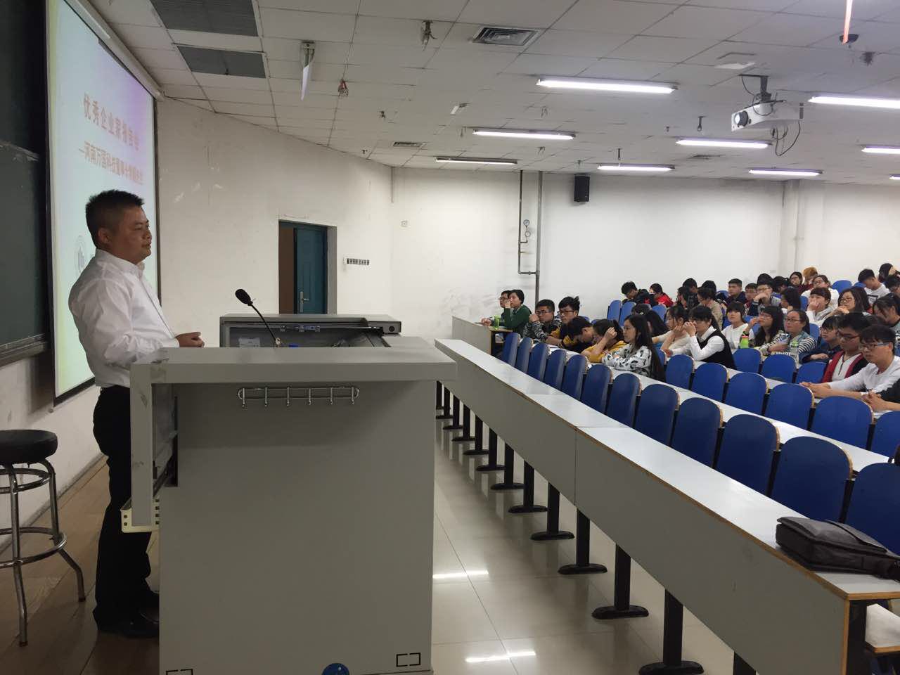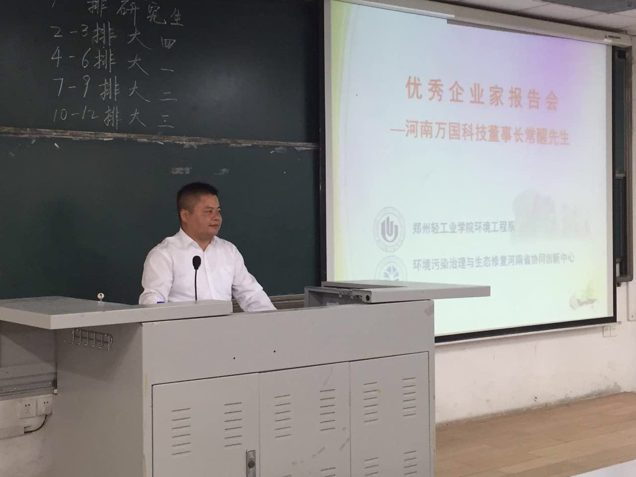 应材料与化学工程学院与“环境污染治理与生态修复河南省协同创新中心”邀请,河南万国科技股份有限公司董事长常醒先生于2016年4月10日下午在科学校区电教楼109为我校环境工程专业全体本科生和研究生作了“优秀企业家创新创业报告会”。中心常务副主任张宏忠教授主持了这次报告会。