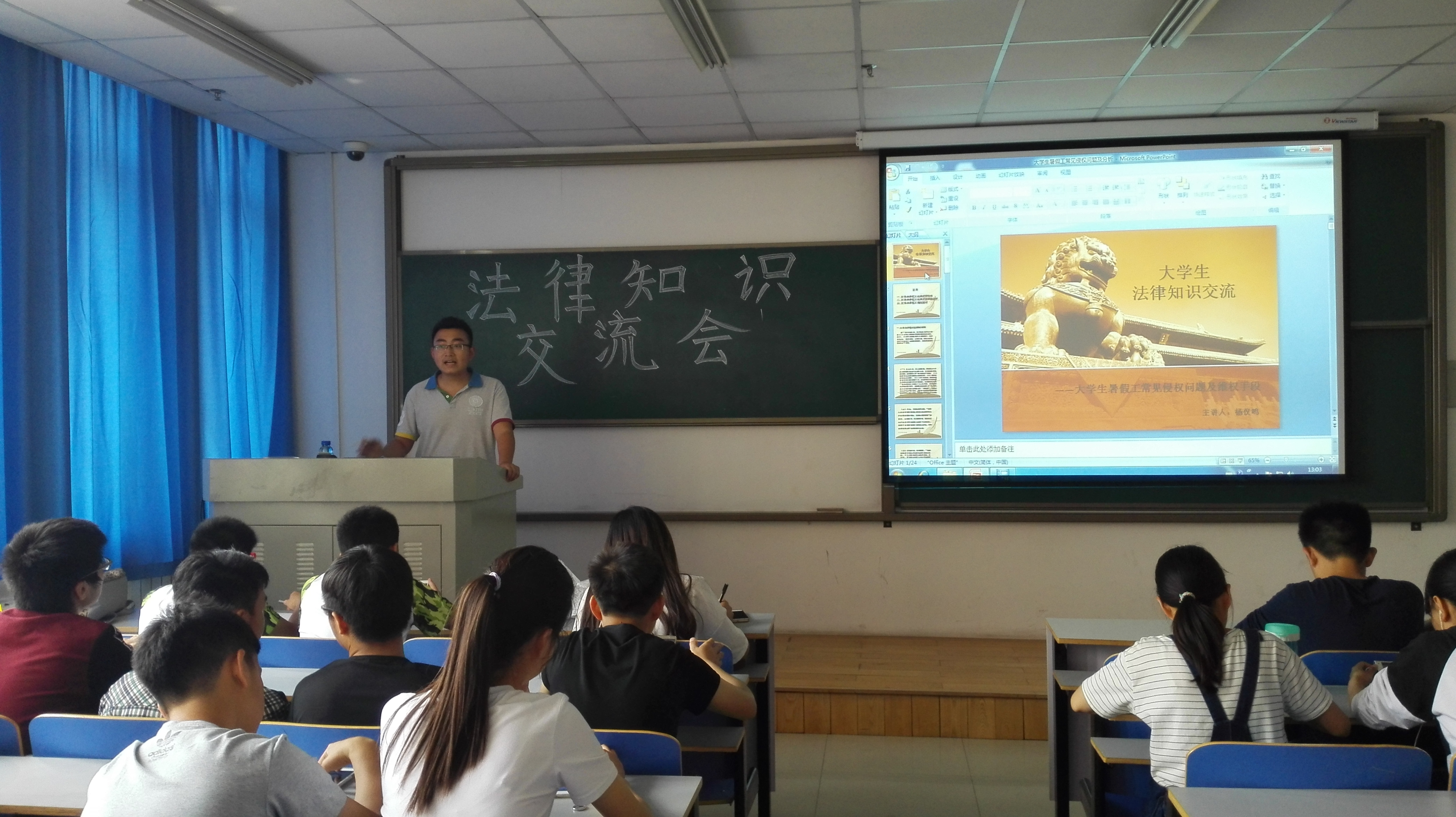为了提高大学生的法律维权意识,让当代大学生做到知法、守法、用法,促进校园生活更加和谐美好。材料与化学工程学院于5月12日在一教楼311举办法律知识交流会,本次交流会邀请大学生法律援助中心会长杨仪鸣主讲。