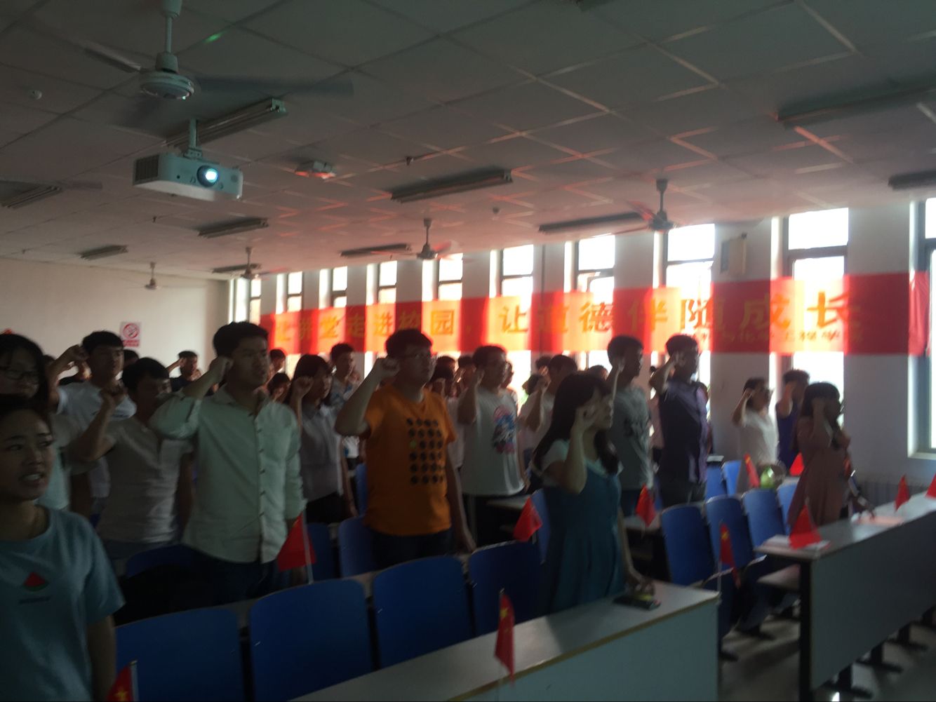 本次活动分为五个部分,第一部分:主持人致辞后,由两位同学开始朗诵“道德在我心”诗歌;第二部分:大家一起观看了“生活中的道德模范”,并且一起参加了讨论;第三部分,由周洋同学为大家带来了“感恩的心”主题歌曲,将活动带入了高潮;第四部分,“说出让你感动的人和事”,大家一起参与了分享和交流。第五部分,由张欢同学带领大家一起宣誓,为本次道德讲堂画上了圆满的句号。