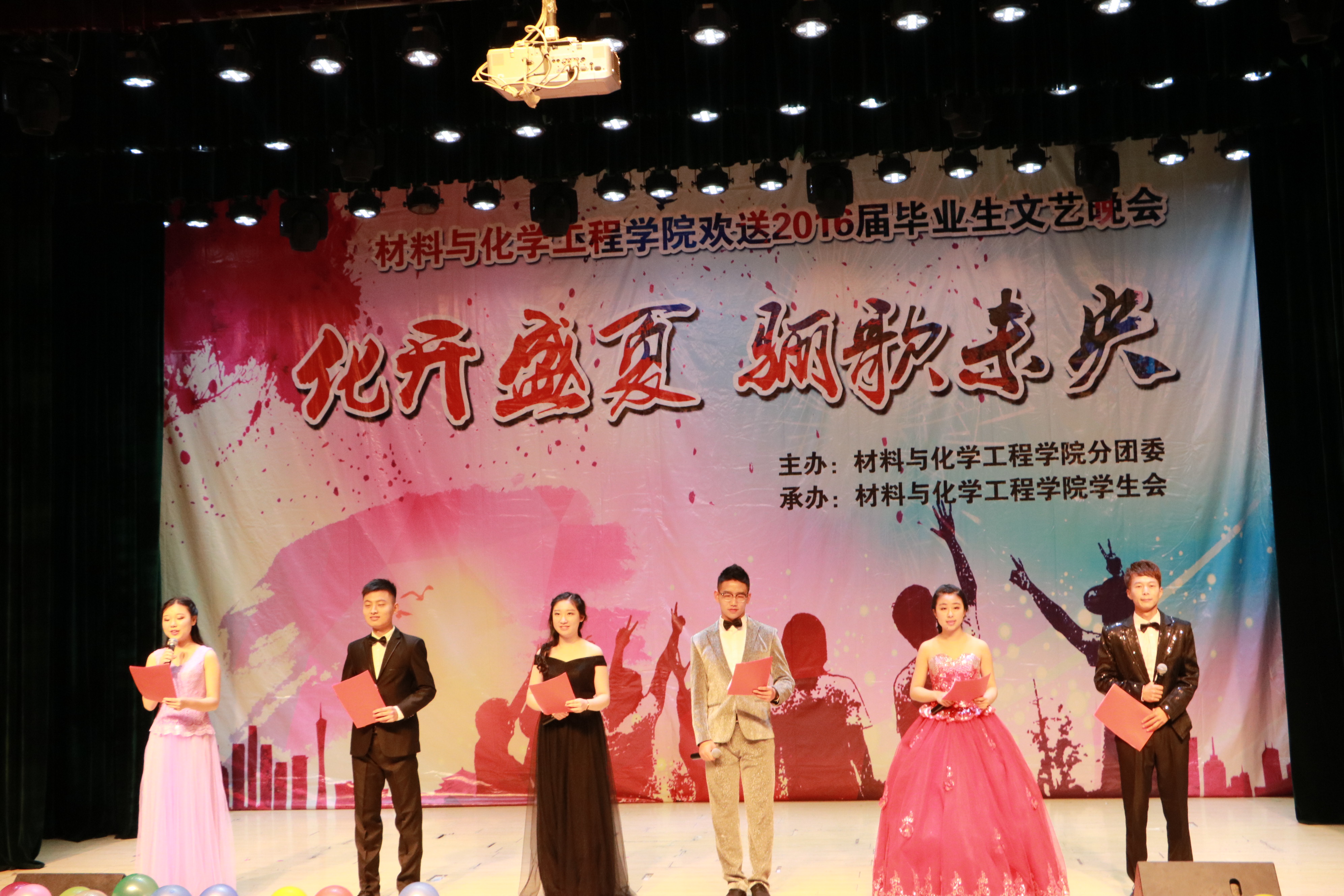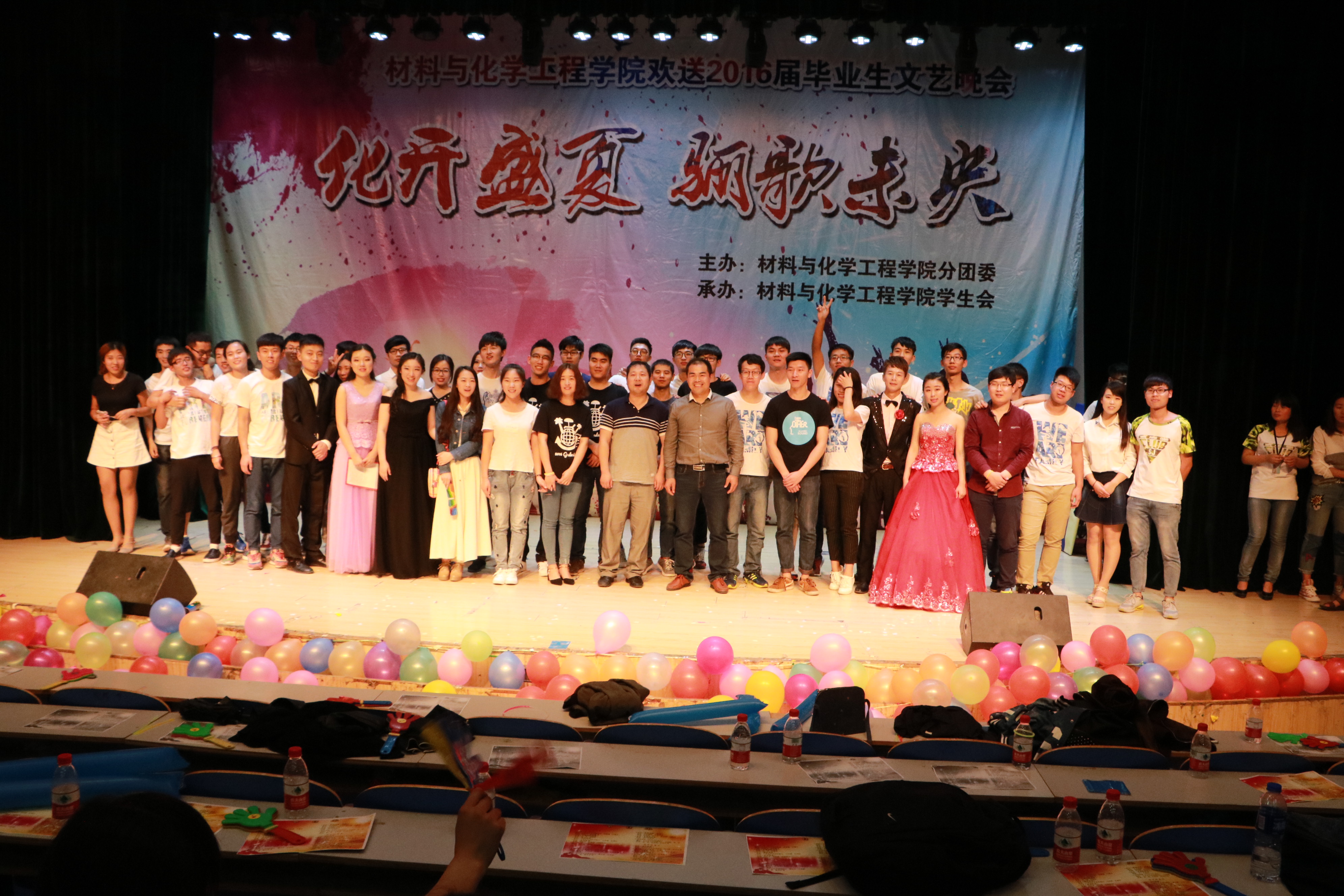 2016年5月27日晚上6:30,由材料与化学工程学院分团委主办,学生会承办以主题为“化开盛夏,骊歌未央”的送别2012级毕业生文艺晚会在科学校区三教楼208正式拉开序幕。晚会上材料与化学工程学院党委副书记宋德涛老师出席观看并致辞,分团委书记朱广正老师一曲《亲爱的小孩》送给毕业生们,表达了他们对毕业生美好的祝愿。学生会主席孙琦尚,分团委副书记周彦培带领全体学生会成员在台前幕后进行各项工作。