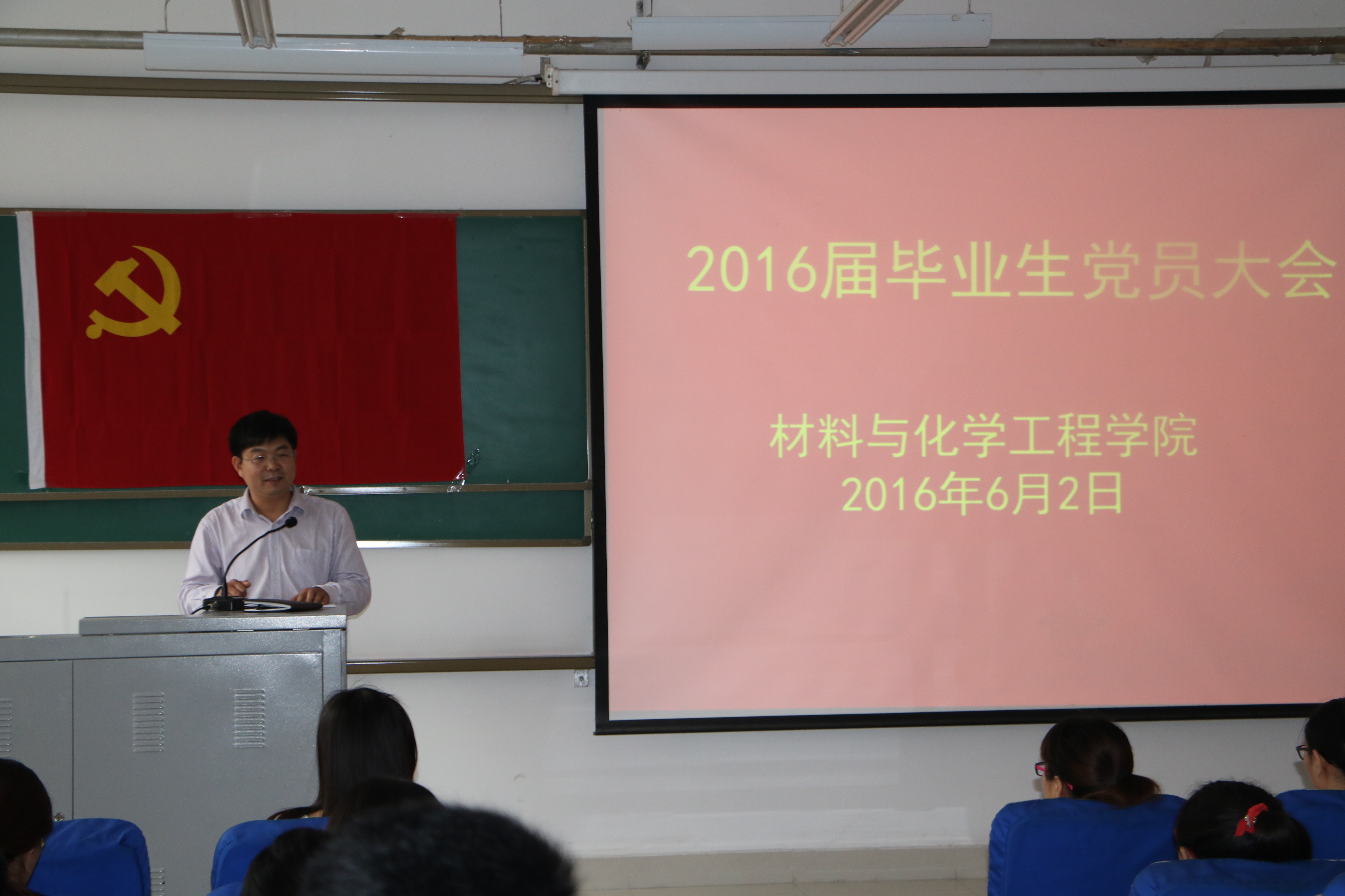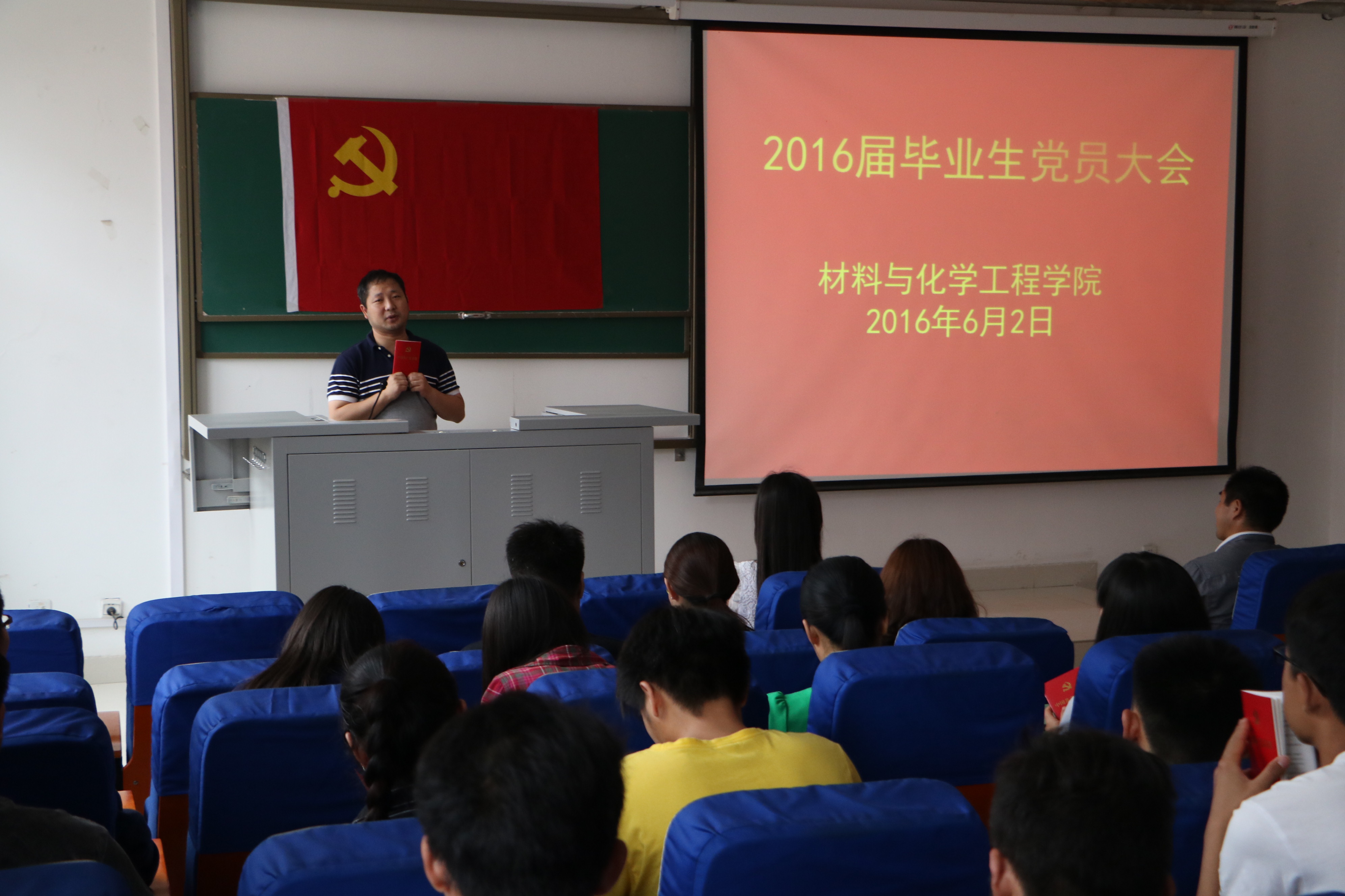 6月2日 下午16:00,材料与化学工程学院在科学校区化工楼218教室召开毕业生党员大会。学院党总支康国磊书记、宋德涛副书记出席,学生党支部书记、全体毕业本科生、研究生党员参加大会。大会由宋德涛副书记主持。