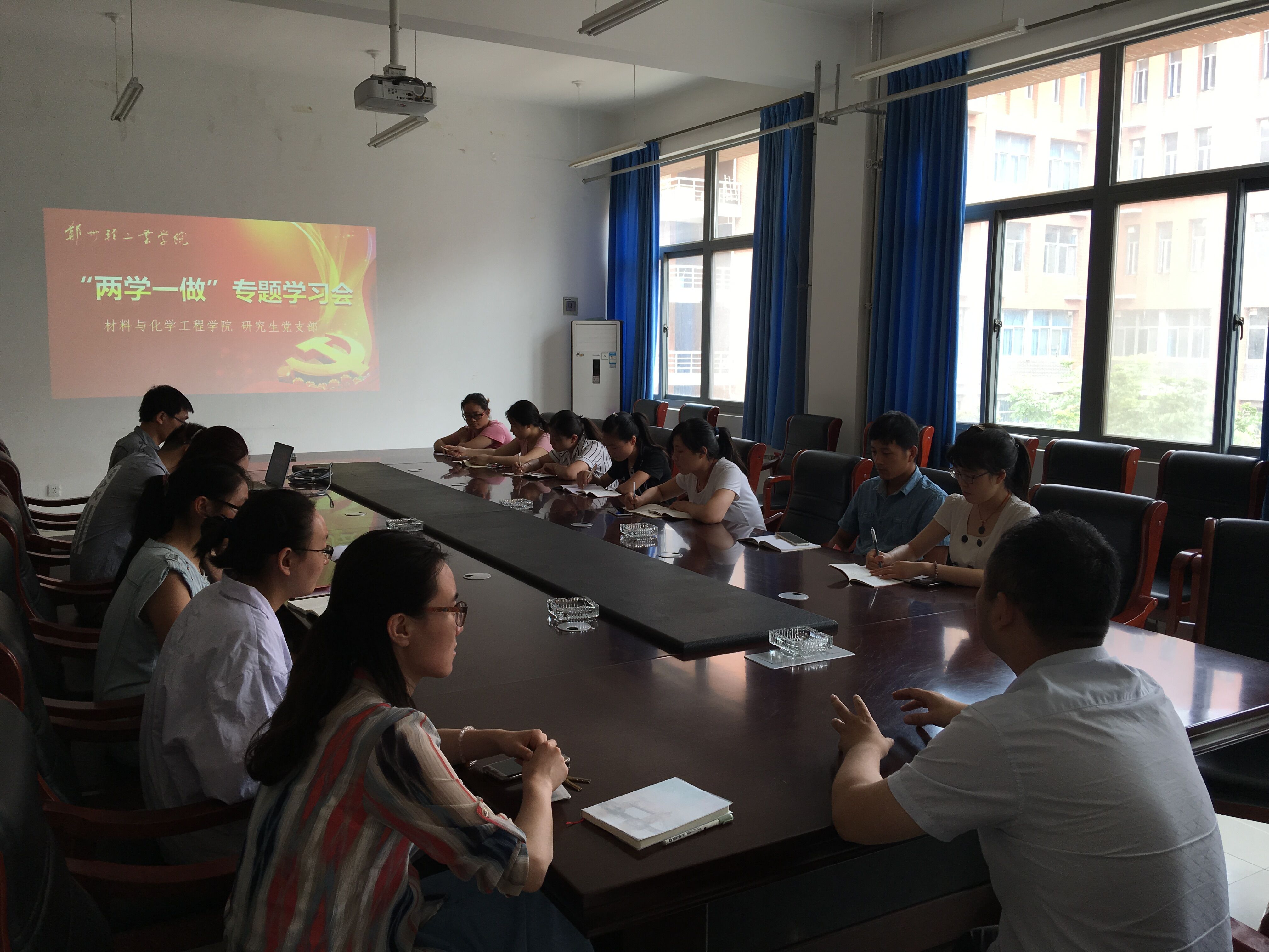 为贯彻落实中共中央关于开展“两学一做”学习教育,深化党内教育,推动推动党内教育从“关键少数”向广大党员拓展,加强从严制党。6月14日上午,材料与化学工程学院研究生党支部在化工楼222召开“两学一做”专题学习会,学院党总支副书记宋德涛老师、研究生党支部书记周菁老师以及全体研究生党员参加了此次会议。