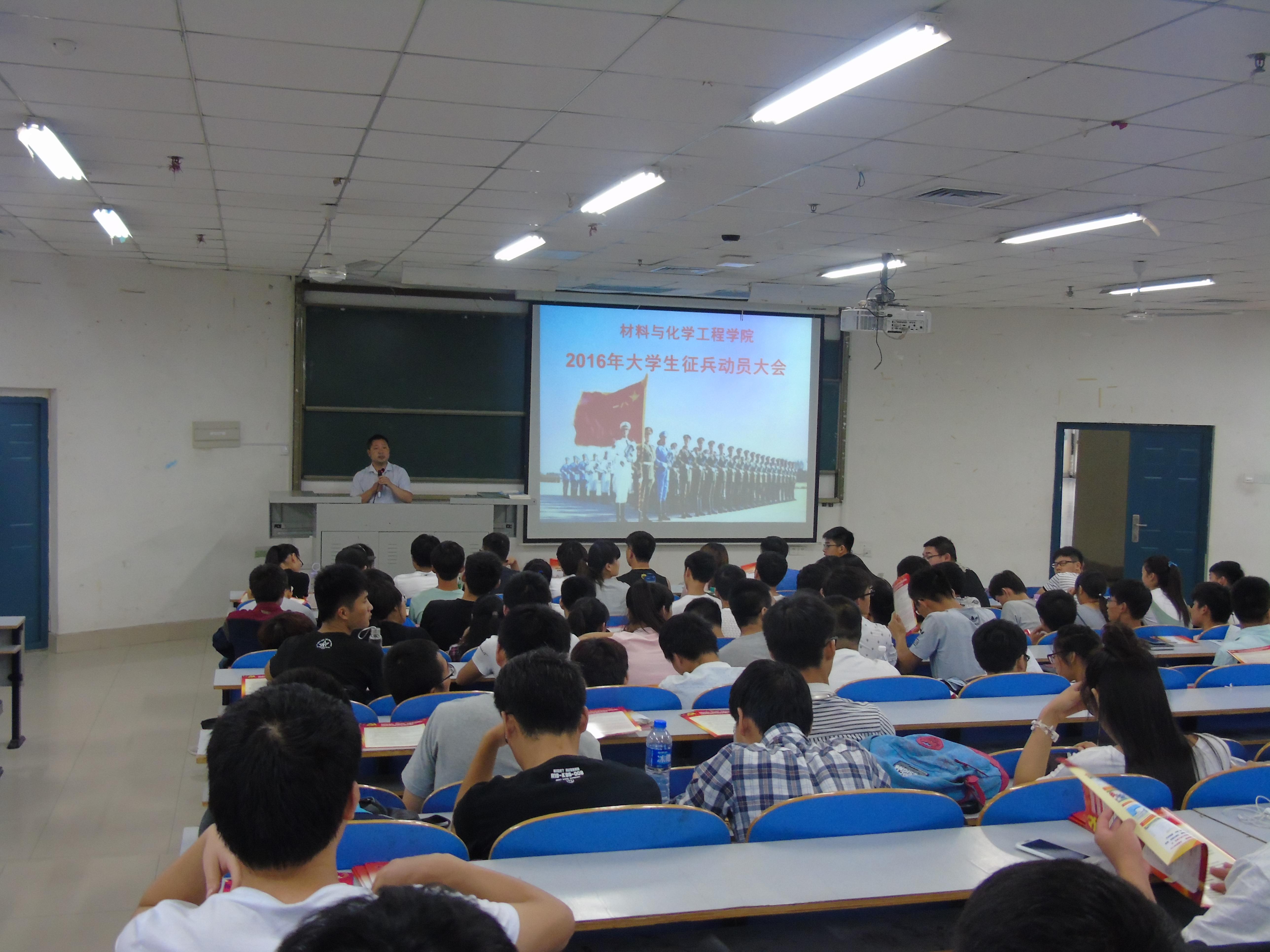 材料与化学工程学院青年学子有着浓烈的爱国激情,2014年,化工学院有8名本科生参军入伍,挥洒青春热血,为祖国的国防建设贡献自己的力量。本次动员会为全院学生提供了了解大学生应征入伍政策和征兵流程平台,营造了关心国防、支持国防建设的良好氛围,激发了同学们应征入伍、投笔从戎、报效祖国的热情。学院将按照上级及学校相关要求,积极做好我院2016年大学生应征入伍的报名统计、审核、学费代偿等相关服务工作。
