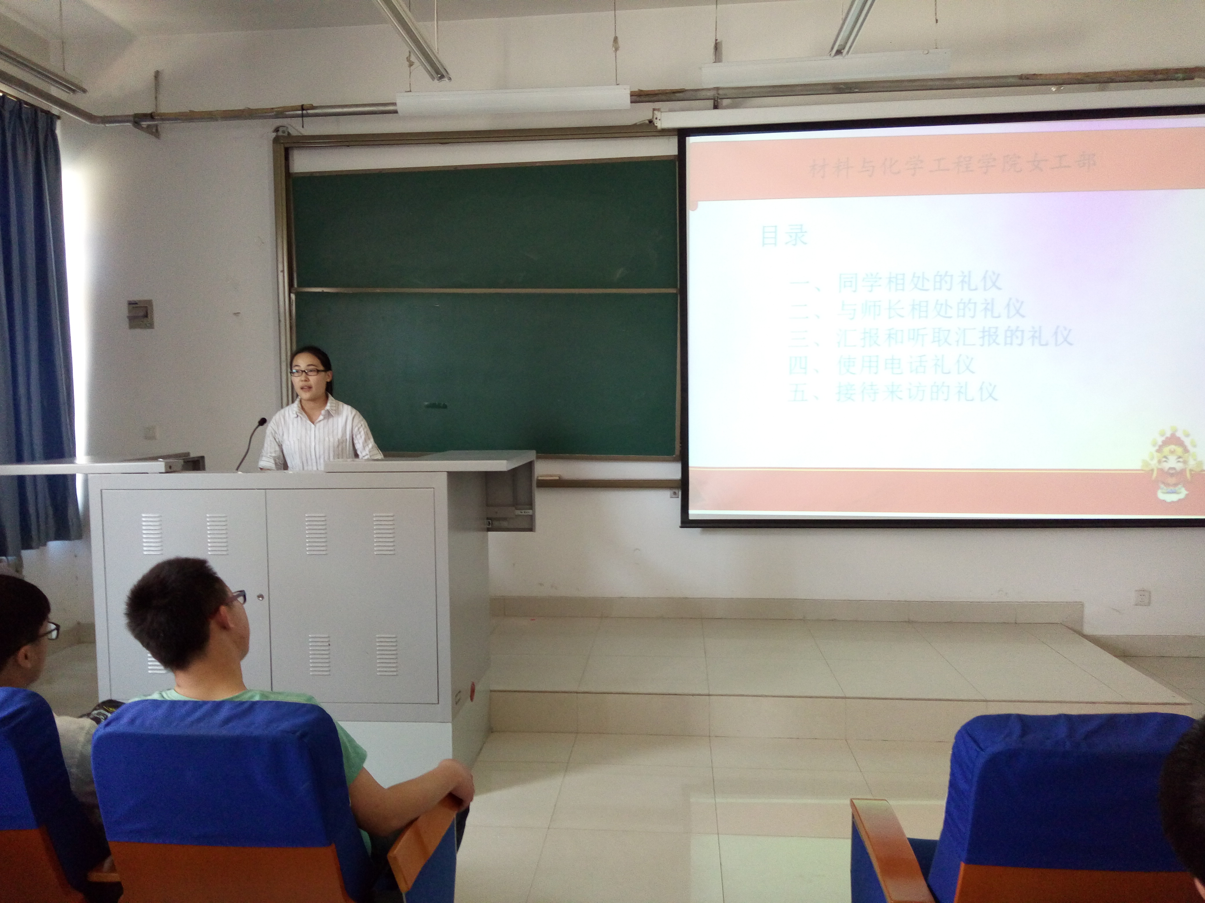 为了庆祝中国共产党建党95周年,激发青年大学生活力,普及社交礼仪的基本规范和知识,提升学生的文明修养素质,2016年6月16日中午12:30,材料与化学工程学院在化工楼218开展了关于“文明礼仪”的培训活动。