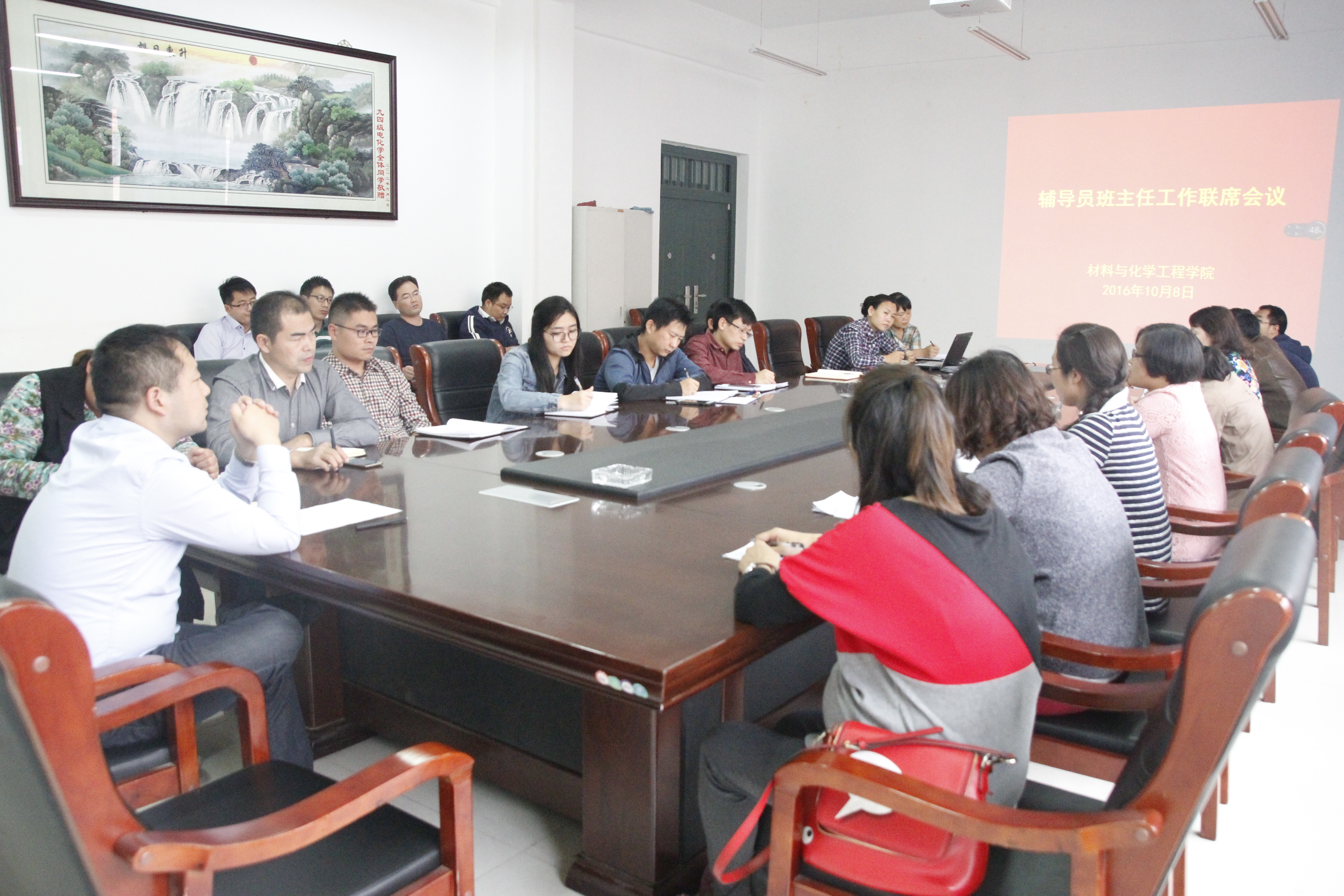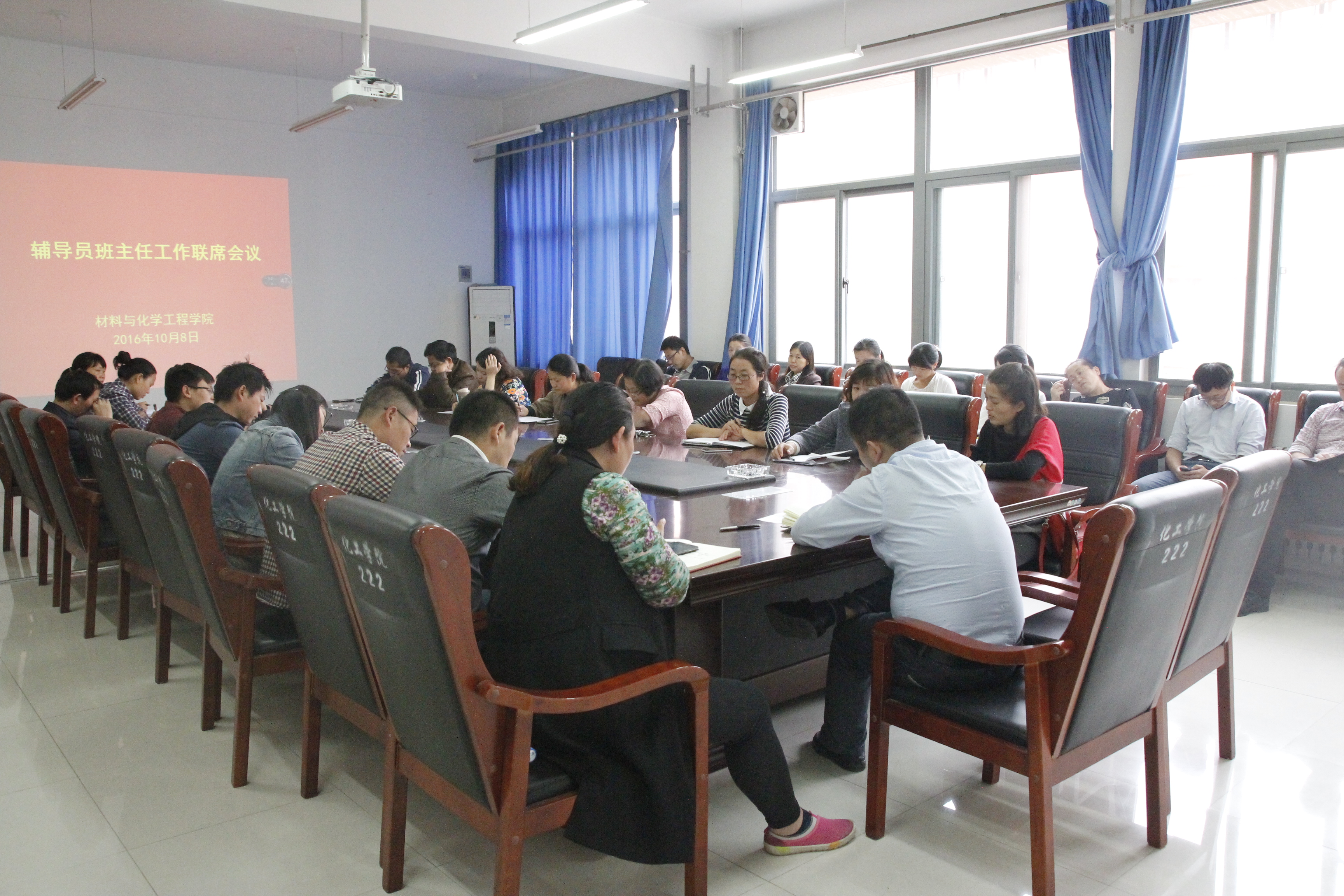 10月8日下午,材料与化学工程学院在科学校区化工楼222会议室召开辅导员班主任联席会议,学院党总支副书记宋德涛及全体辅导员和班主任参加了会议。会议由学工办主任郭智荣老师主持。