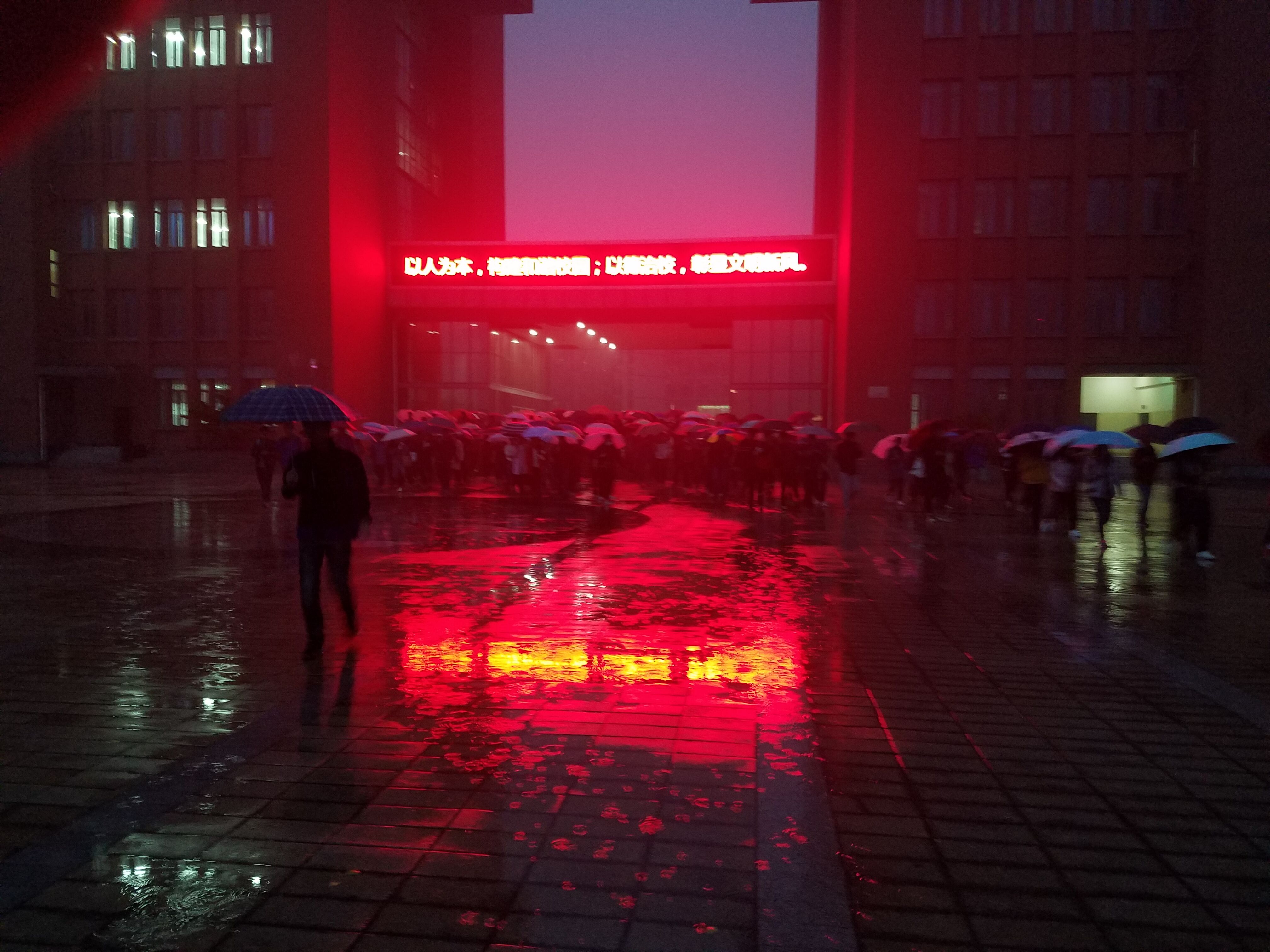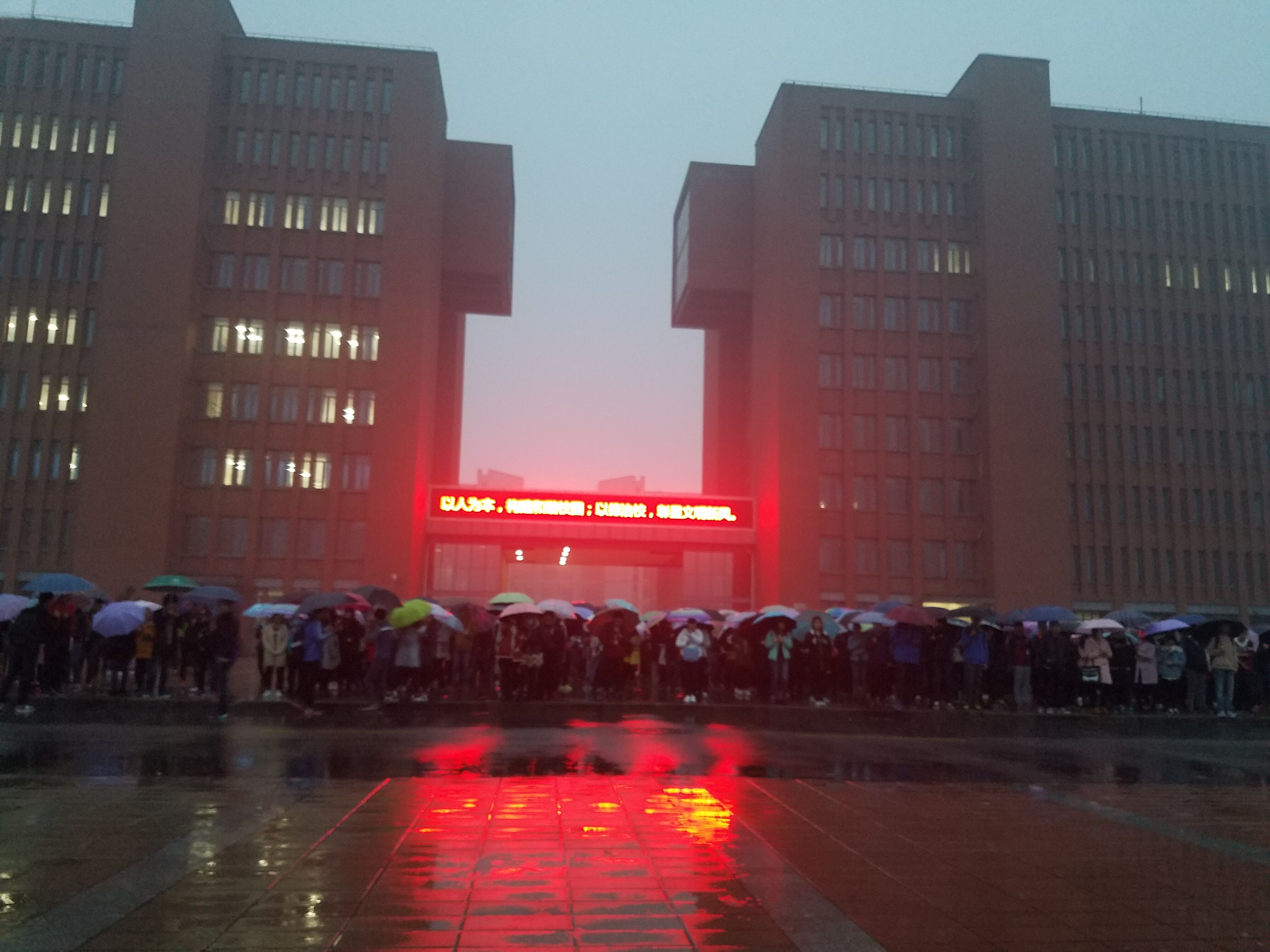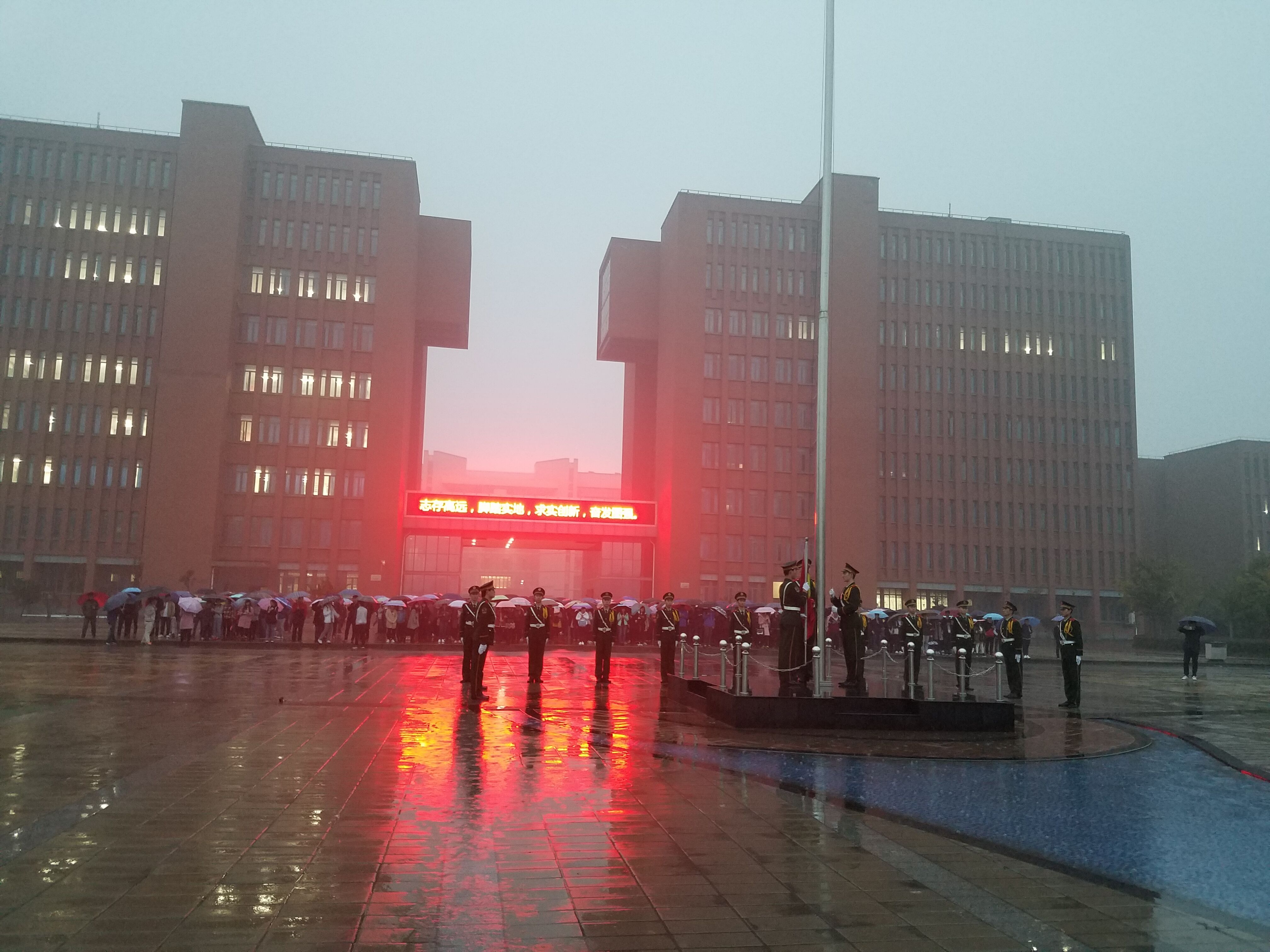 六点四十分天色未亮,阴冷的天空又中飘起了小雨,我院学子已冒雨全部集合完毕,静待五星红旗的升起,接着国旗班的升旗手们迈着铿锵的步伐护卫着鲜艳的五星红旗入场。伴随着《义勇军进行曲》的响起,五星红旗冉冉升起,在场的同学放下手中的雨伞,集体行注目礼,在这庄严肃穆的气氛中同学们忘记了严寒,忘记了风雨,鲜艳的五星红旗仿佛一道阳光照亮了黑暗、驱散了寒冷。