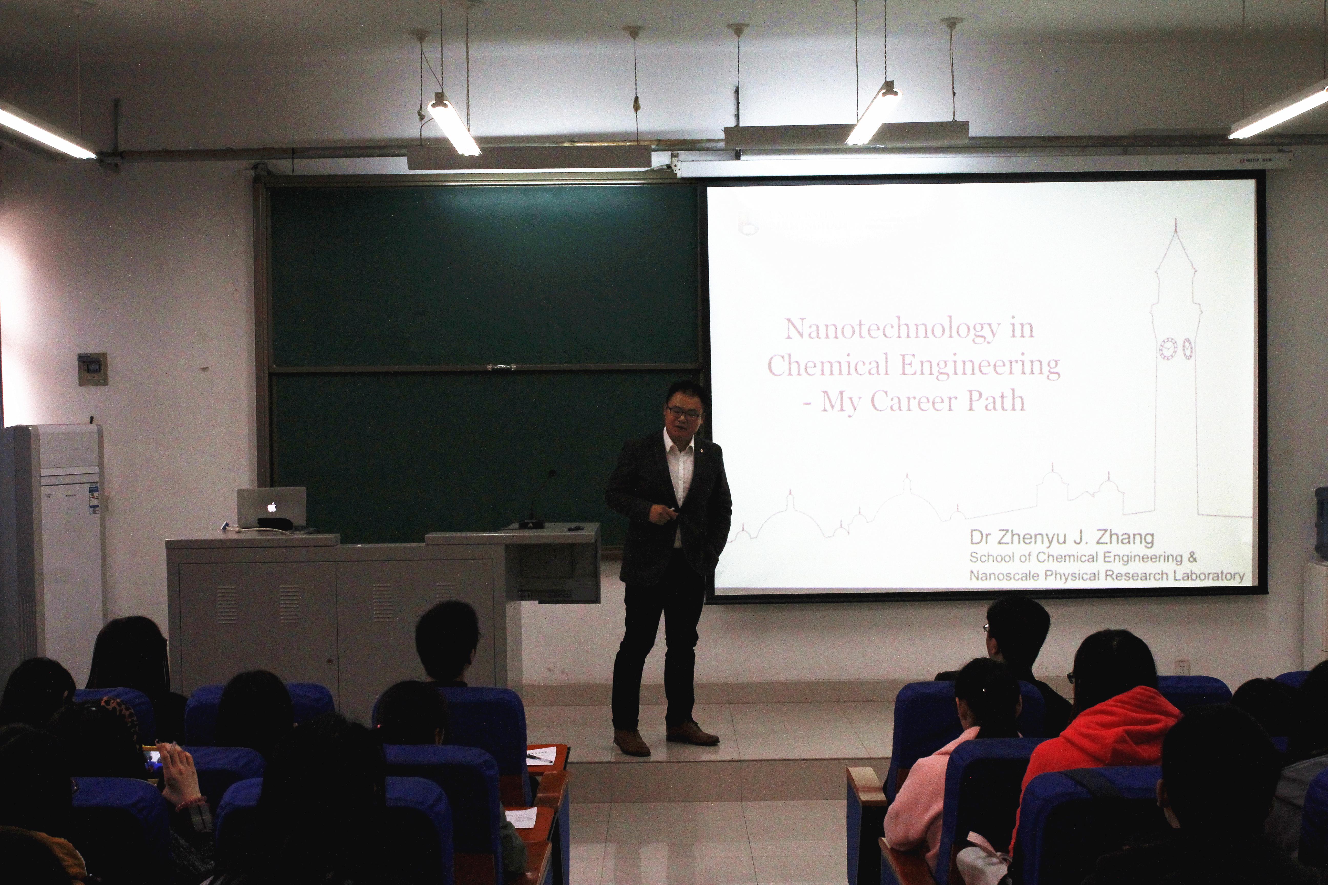 聘任仪式后,张振宇博士给我校师生做了“My Career Path - Nanotechnology in Chemical Engineering”的学术报告。