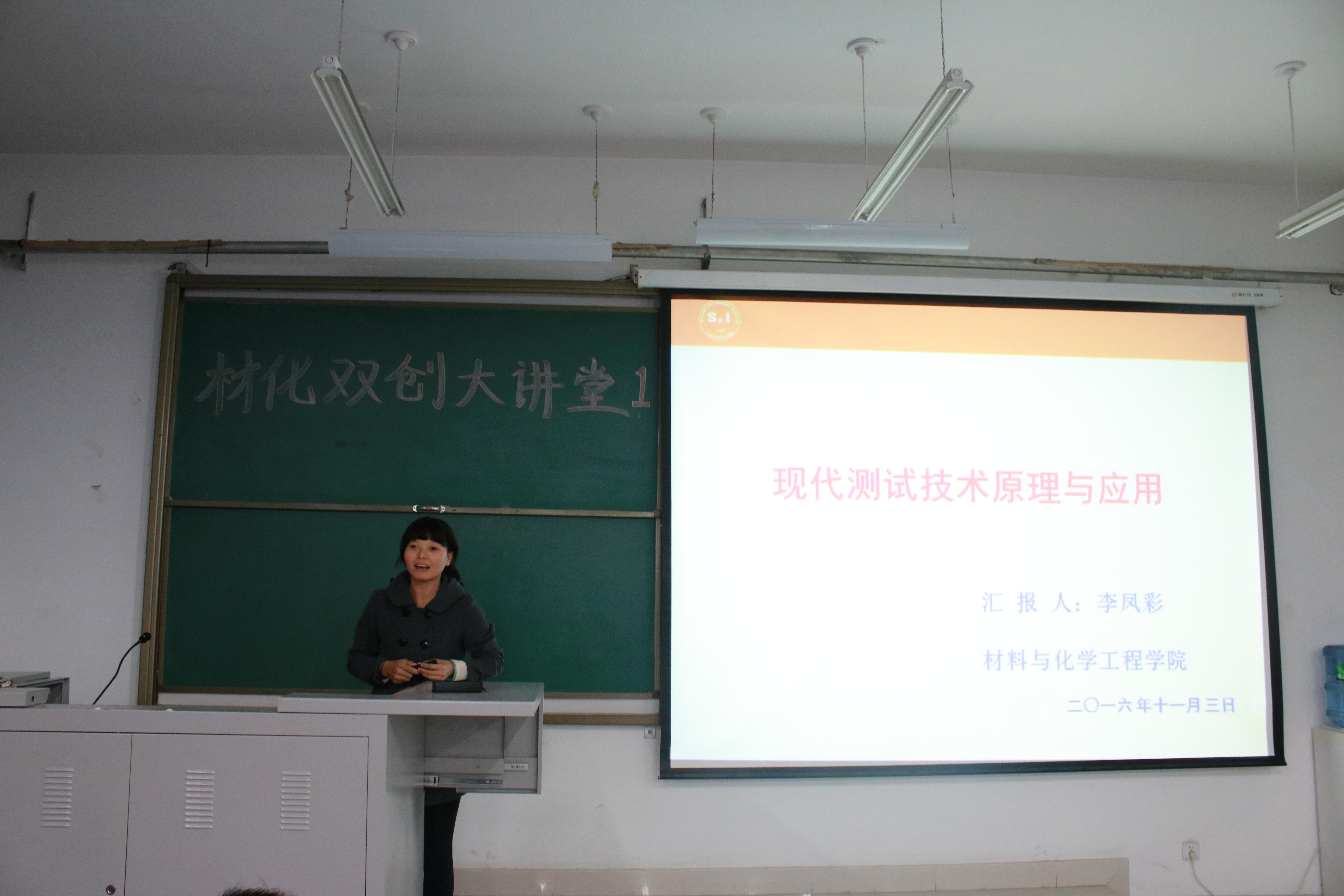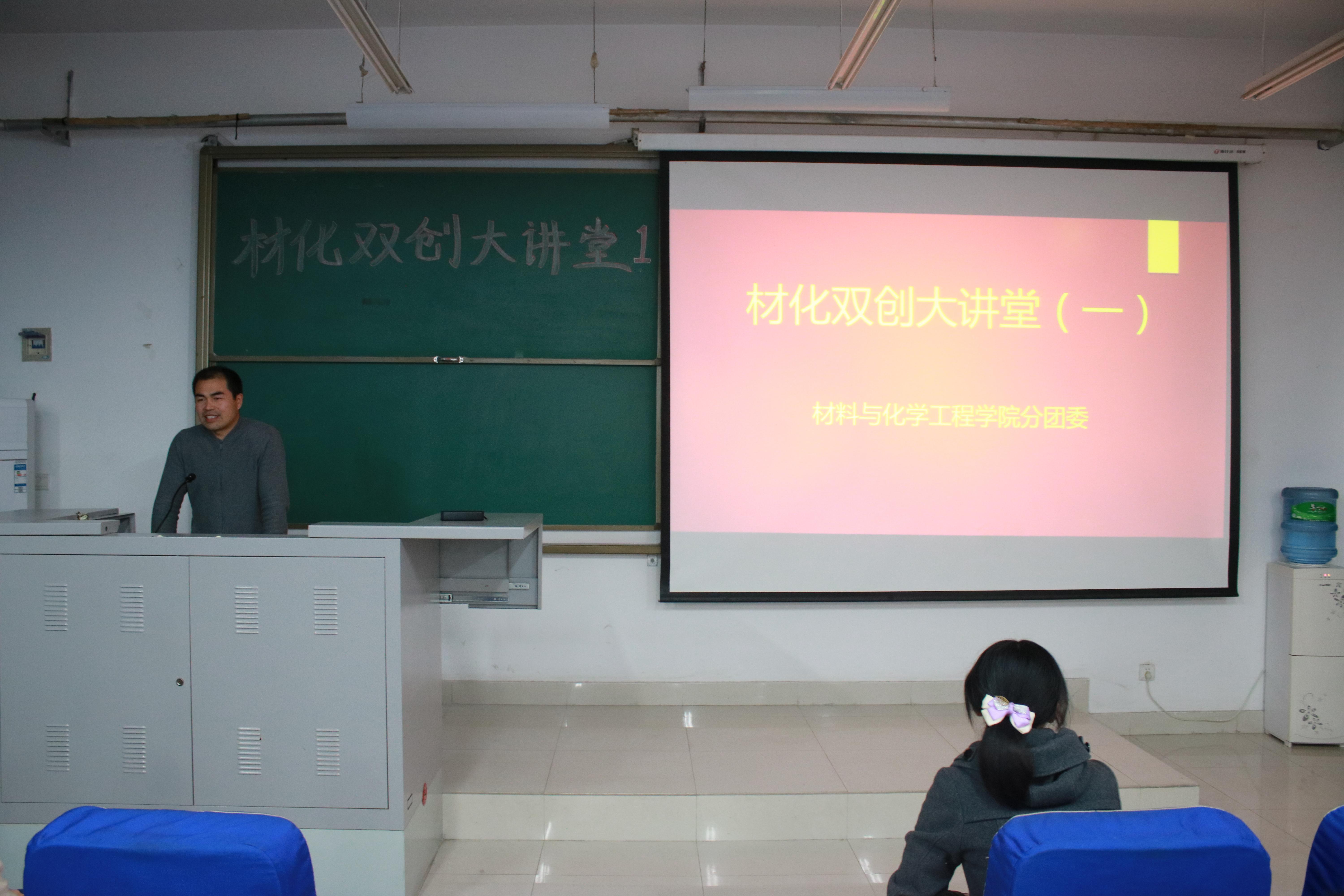2016年11月17日晚,由材料与化学工程学院分团委主办、学生会科技部承办的“材化双创大讲堂”在化工楼218顺利举行,本次讲堂邀请了材料与化学工程学院李凤彩博士、学院研究生辅导员刘欣老师、2014级研究生王利同学作报告,对创新创业感兴趣的130余名同学参加本次活动,讲座由分团委书记朱广正老师主持。