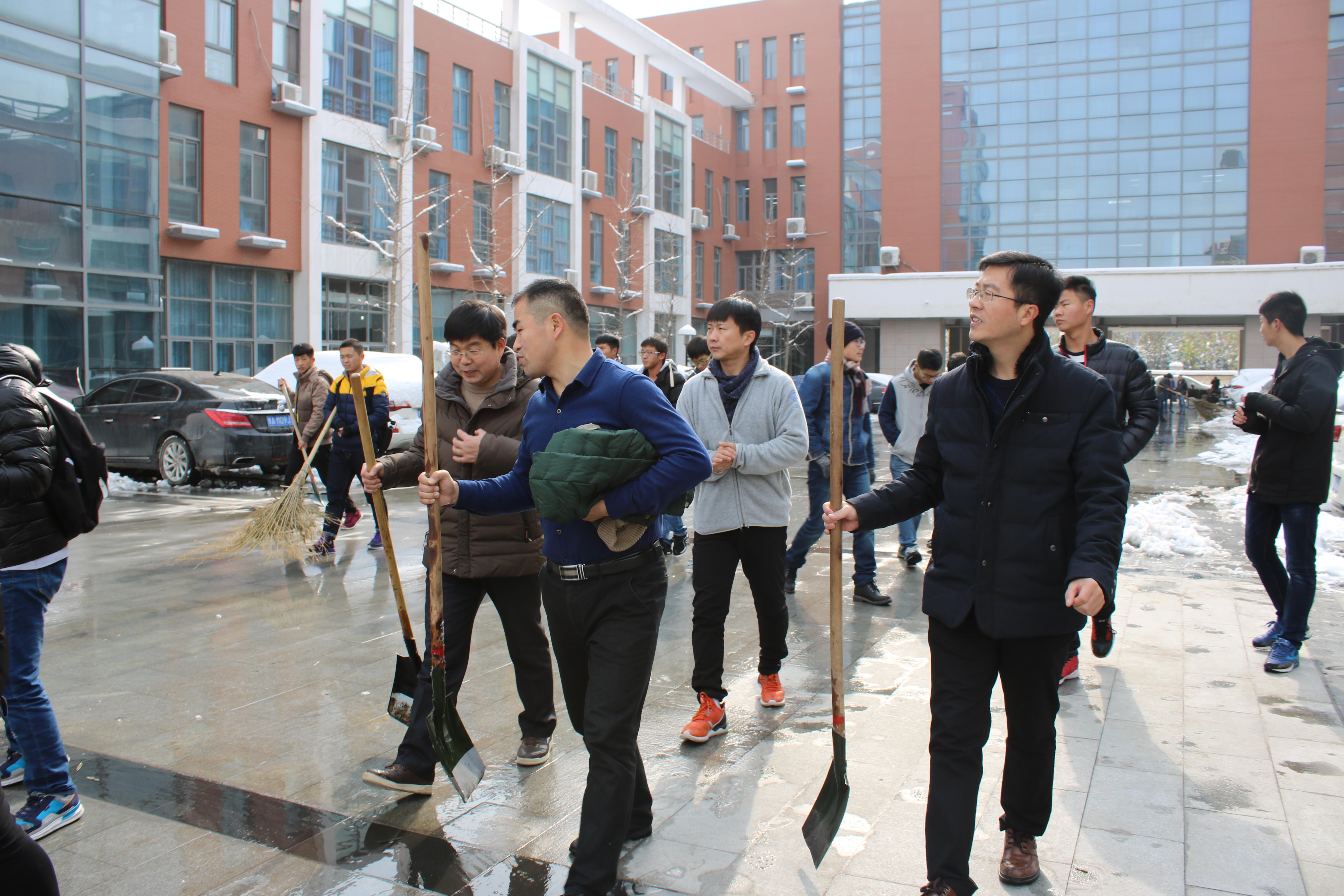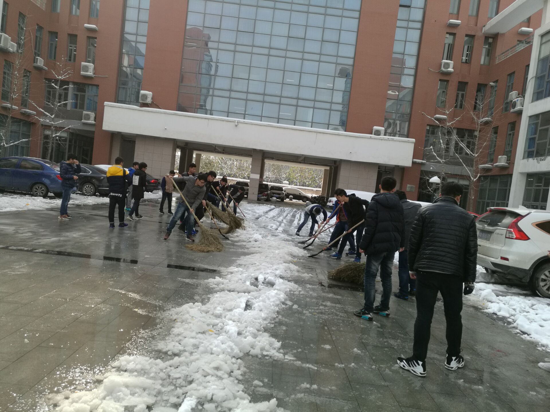 上午十点半,没课的同学及部分老师已经到达化工楼下,大家摩拳擦掌热情高涨,待除雪工具到位后大家分头进行。本次除雪任务分为两部分:一是将学院教学楼周围道路的积雪清理干净,二是将班车乘车点附近主干道上清理出一条通道,方便大家乘车。冬日的太阳虽然耀眼但依旧不能驱走雪后的寒意,虽然大家手上脸上都冻得通红,可是丝毫没有影响热情和工作效率。大家有的用铁锹铲,有的用扫把扫,有的用垃圾车运,不到两个小时就顺利完成了任务,大家在欢声笑语中结束了服务活动。