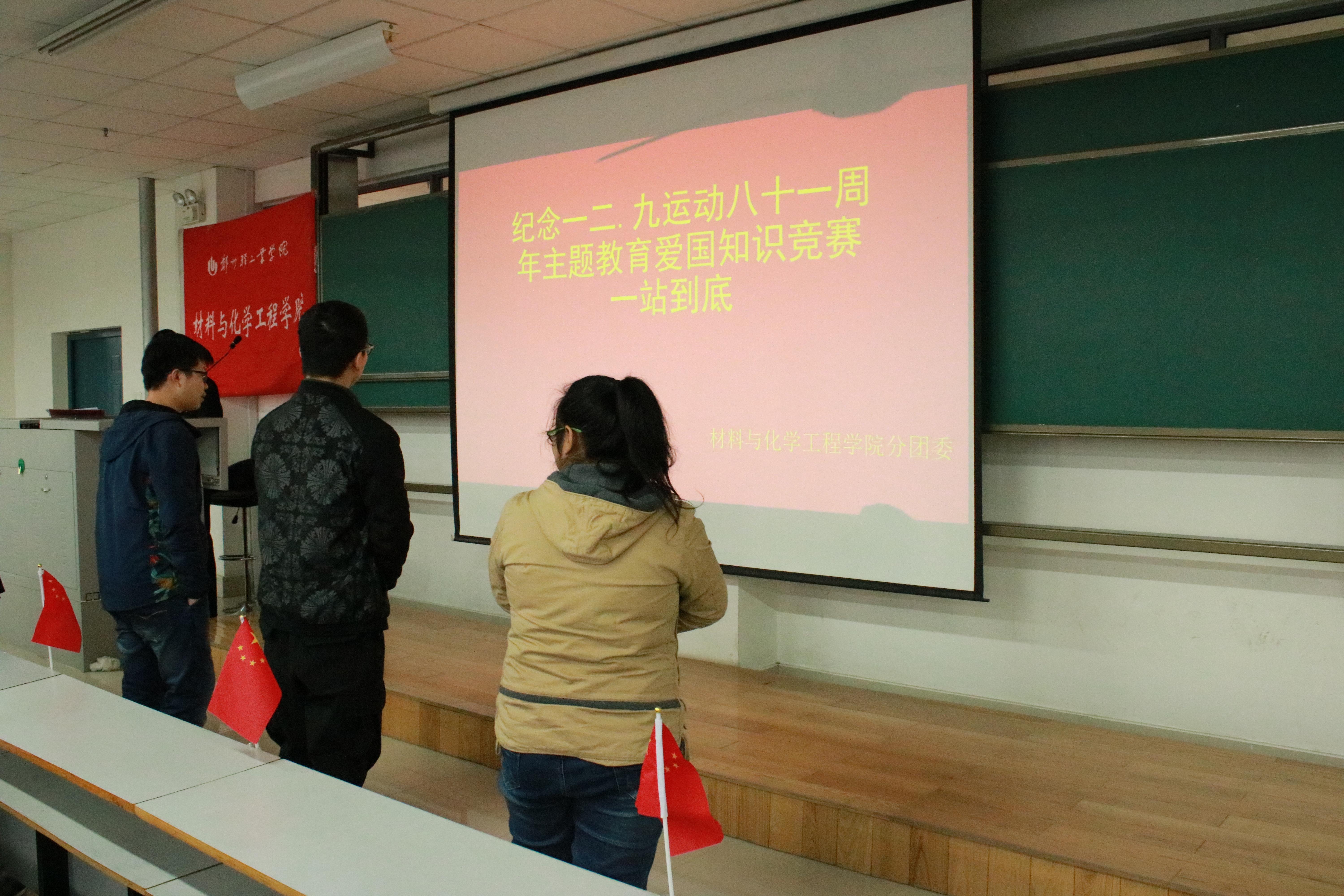 为纪念“一二•九”爱国运动81周年,激励青年团员的爱国热忱,弘扬爱国主义精神,培养青年团员的历史责任感、使命感和高尚的道德情操及增强大学生责任意识,大力弘扬爱国主义精神,材料与化学工程学院于2016年11月23日在二教916举办了“一站到底”纪念一二.九运动八十一周年主题教育爱国知识竞赛。学院分团委学生会代表和15、16级优秀学生代表参与了此次竞赛。