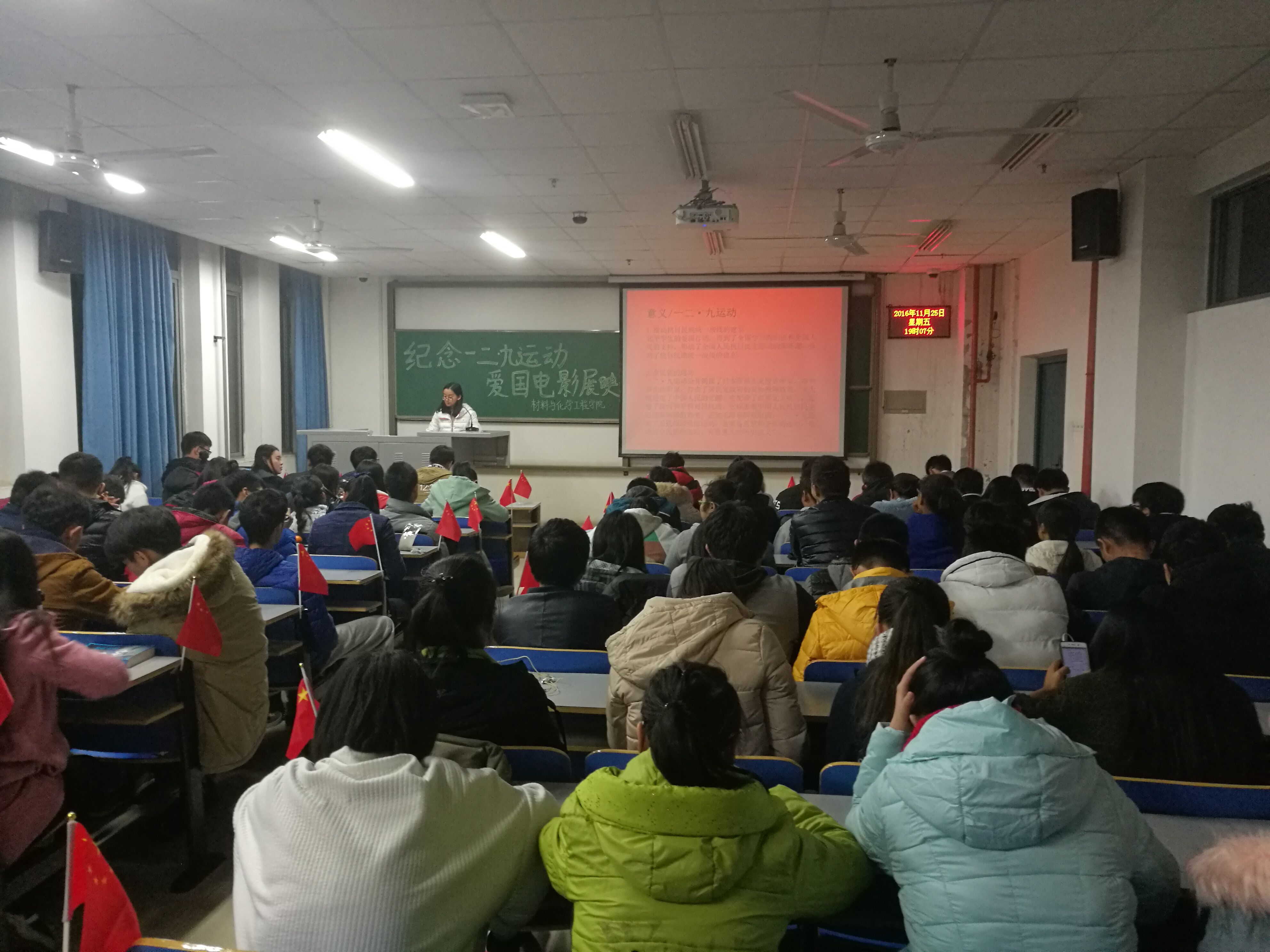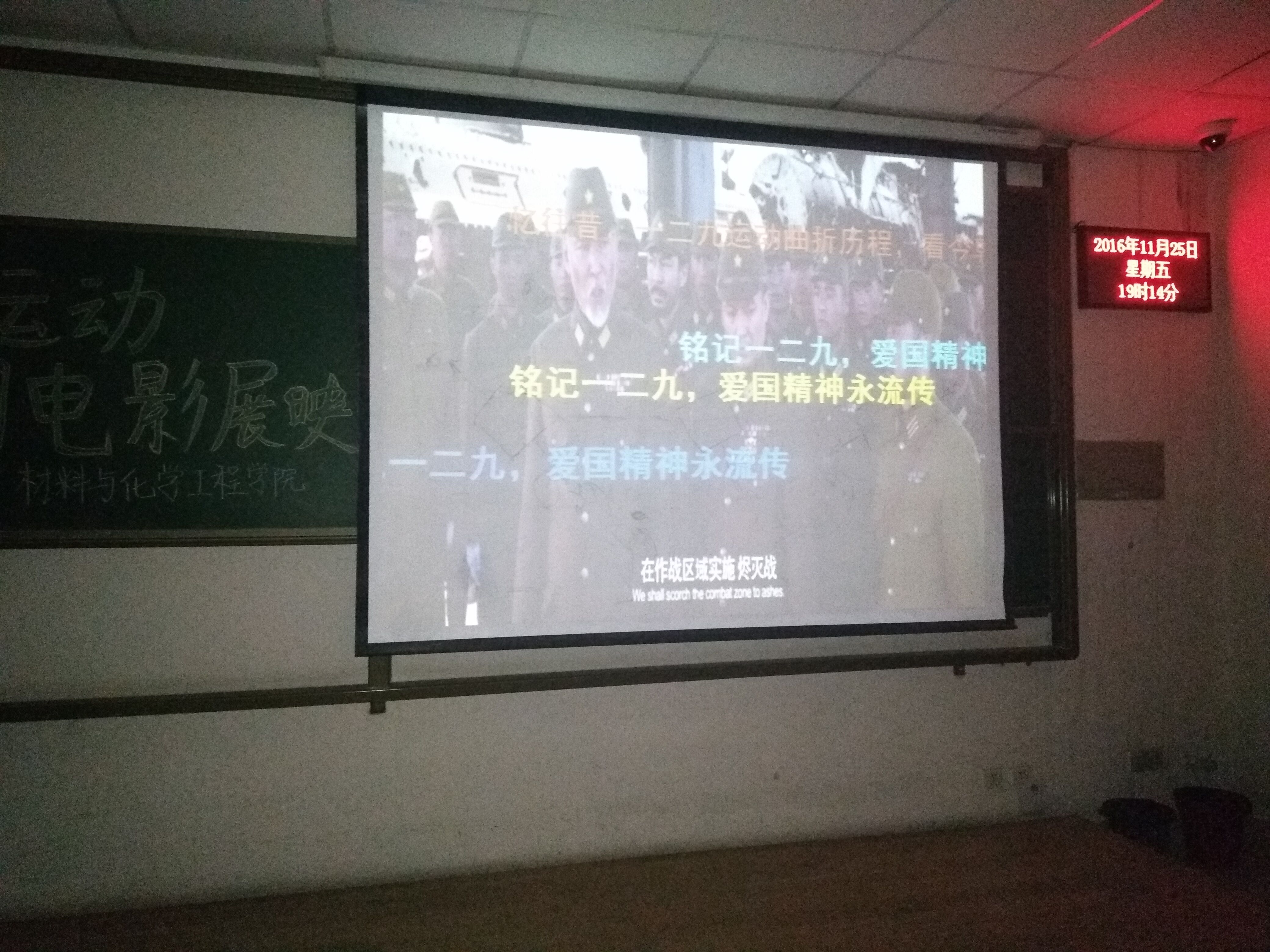 为纪念“一二·九”学生爱国运动81周年,弘扬爱国主义精神,继承和发扬光荣传统,材料与化学工程学院于11月29日19:00在二教楼808开展主题为“弘扬正能量,唱响主旋律”的爱国电影展映活动。活动由学院分团委主办,120余名学生代表参与了本次电影展。