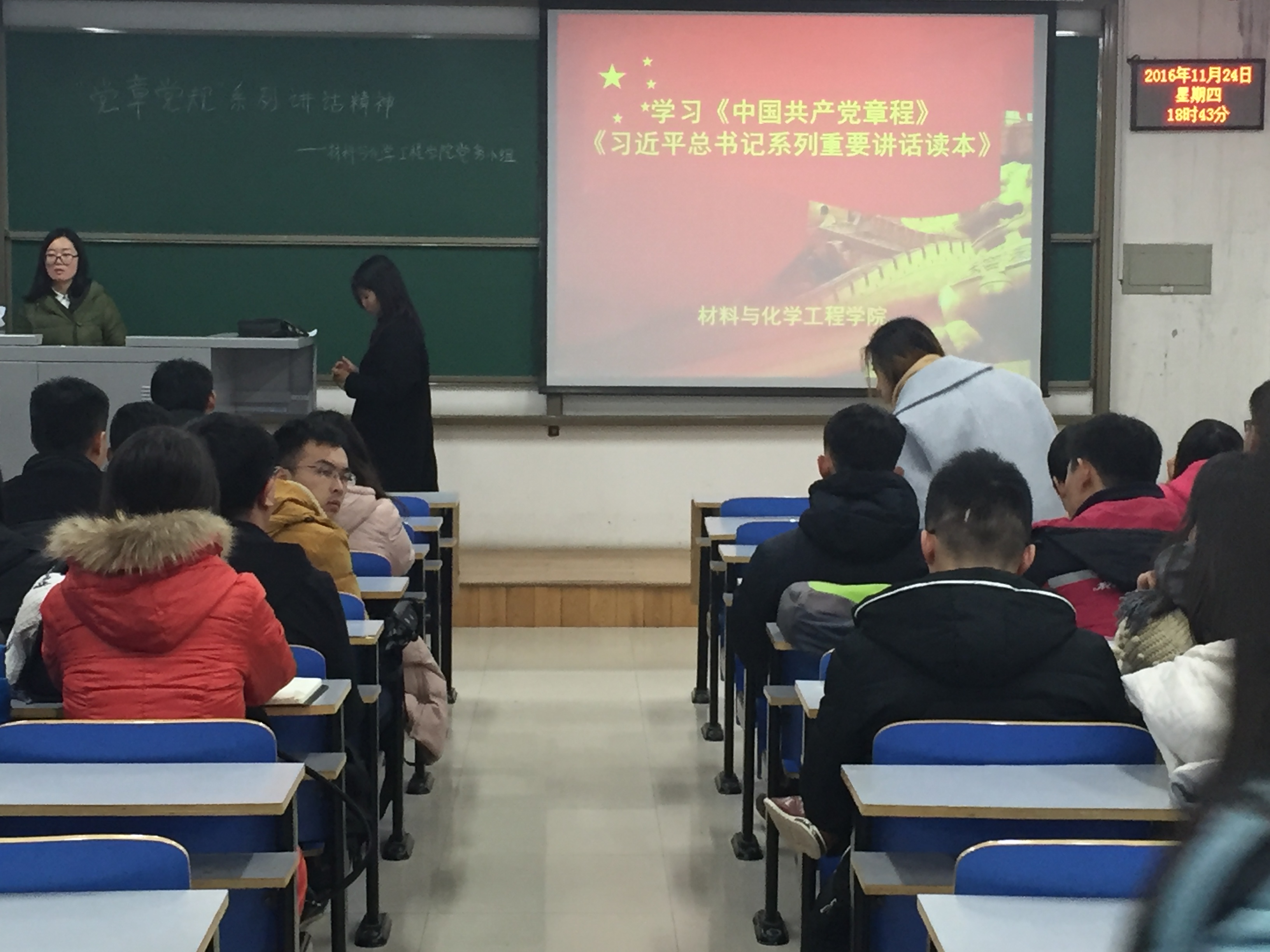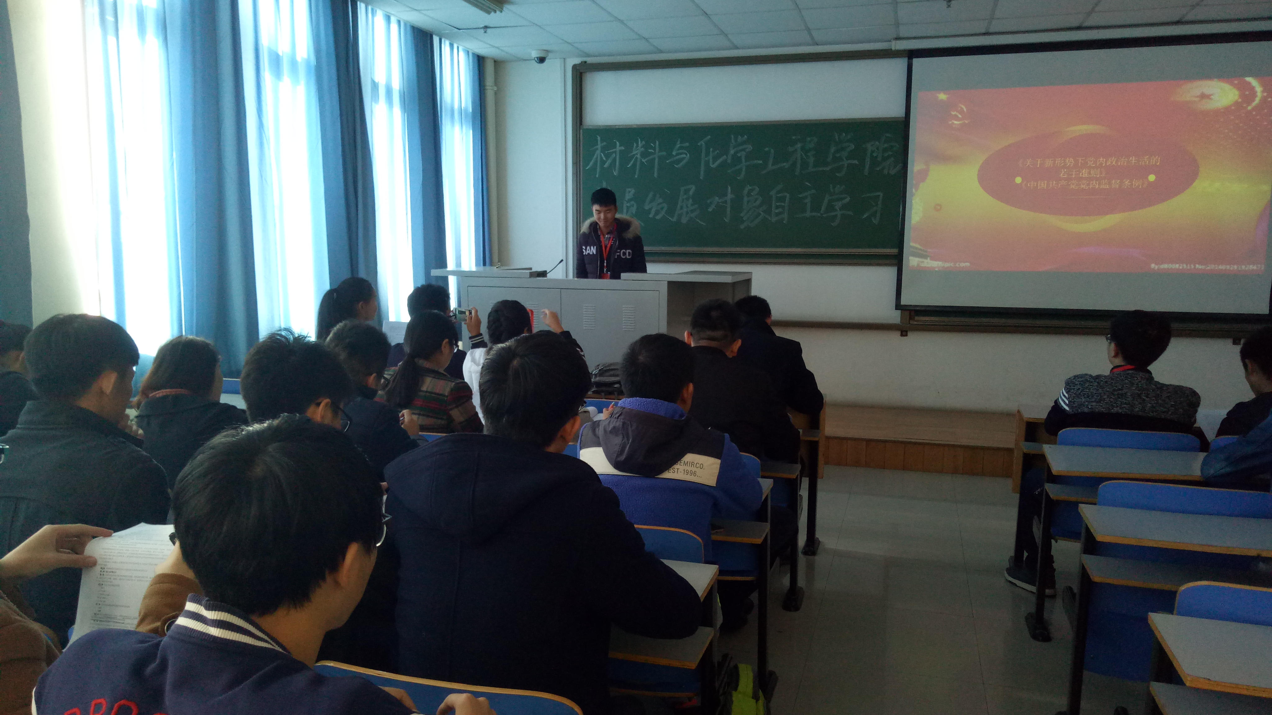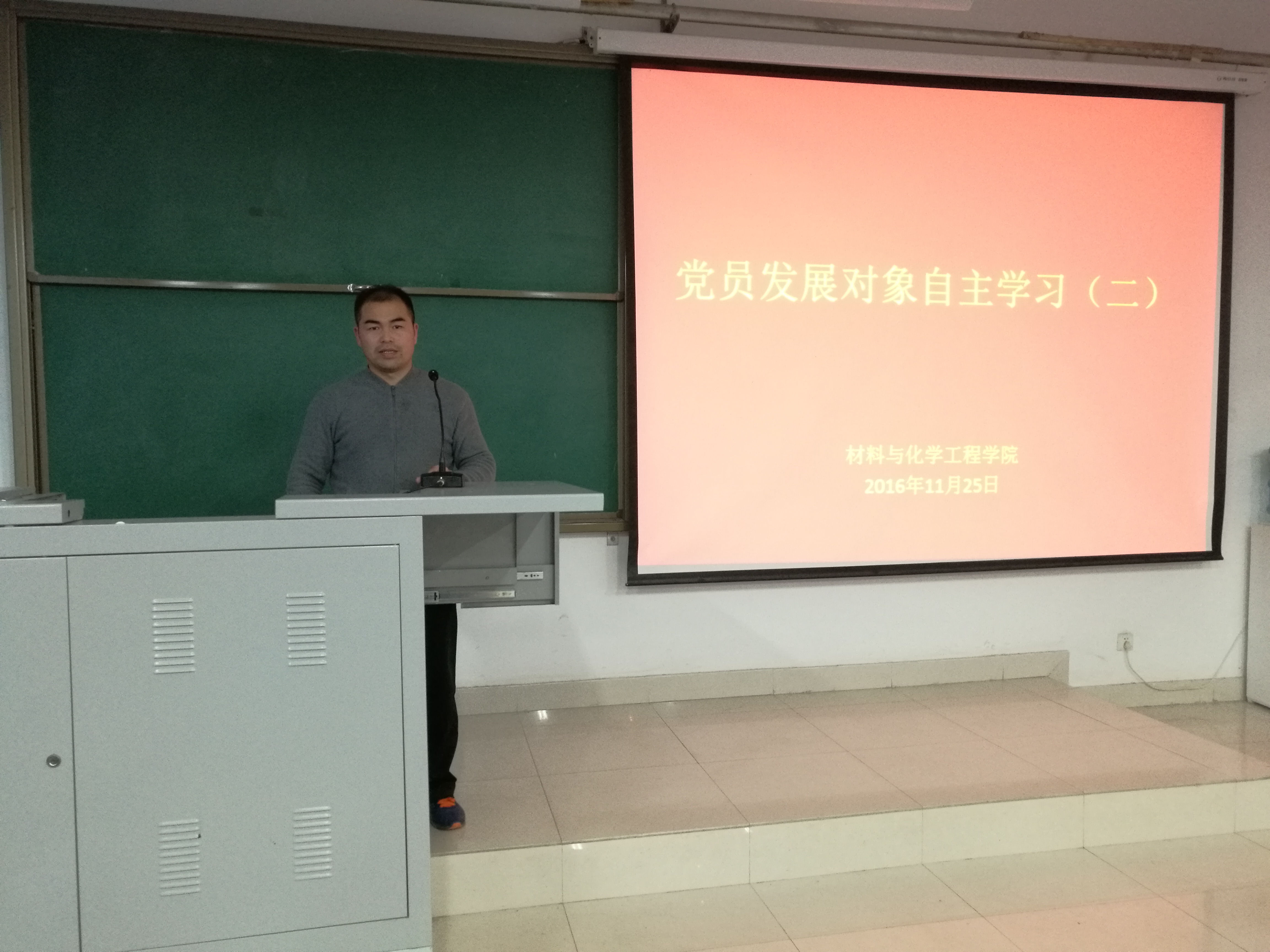 为了进一步提高发展党员的质量,加强发展对象的政治理论学习,按照学校党校第二期党员发展对象培训班的通知要求,在学院党总支的高度重视下,11月24日至30日,材料与化学工程学院本科生党支部联合研究生党支部举办了四次党员发展对象自主学习活动,本科生党支部书记朱广正老师、研究生党支部负责人刘欣老师及全体党员发展对象参加了系列学习活动。