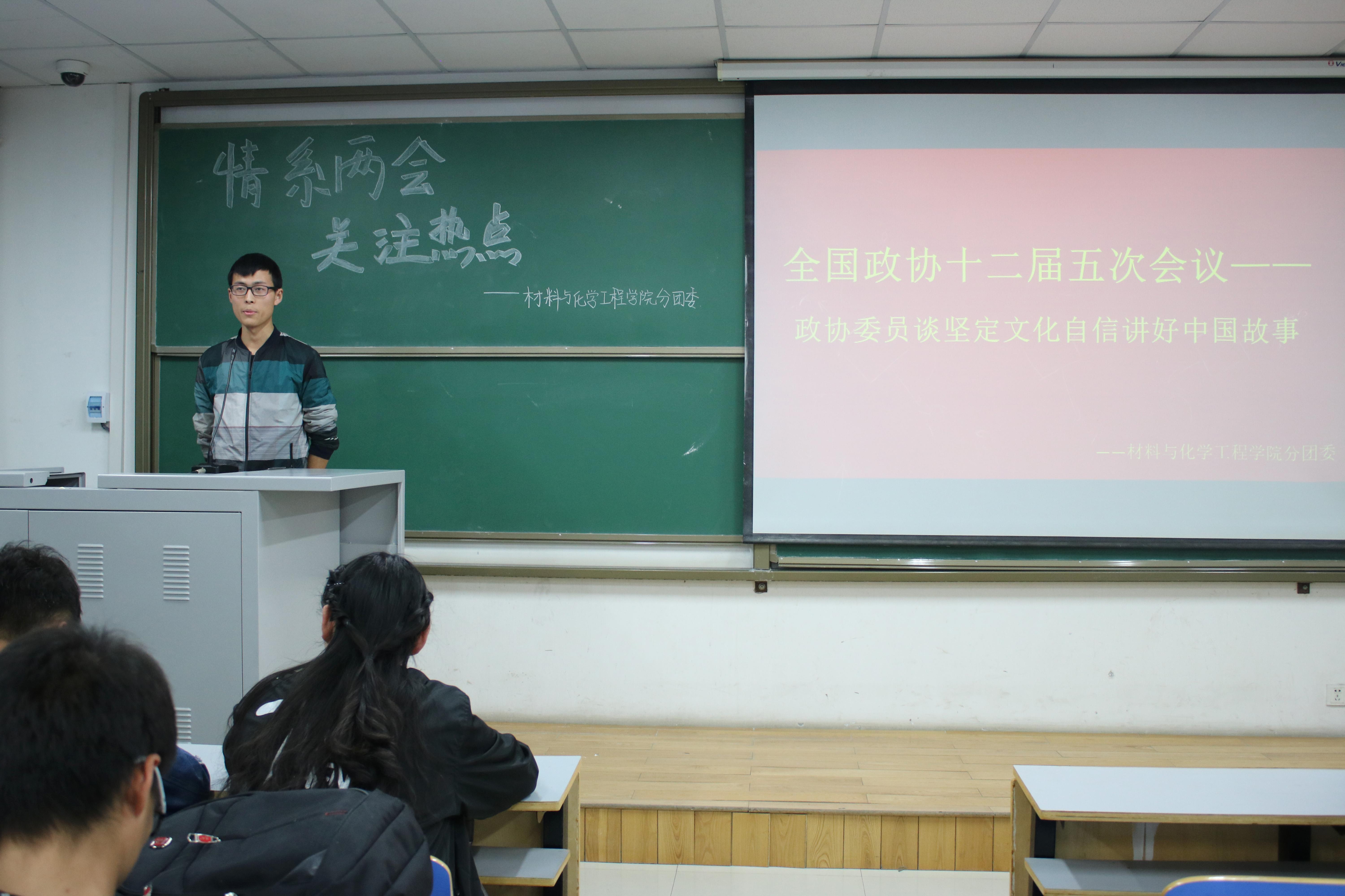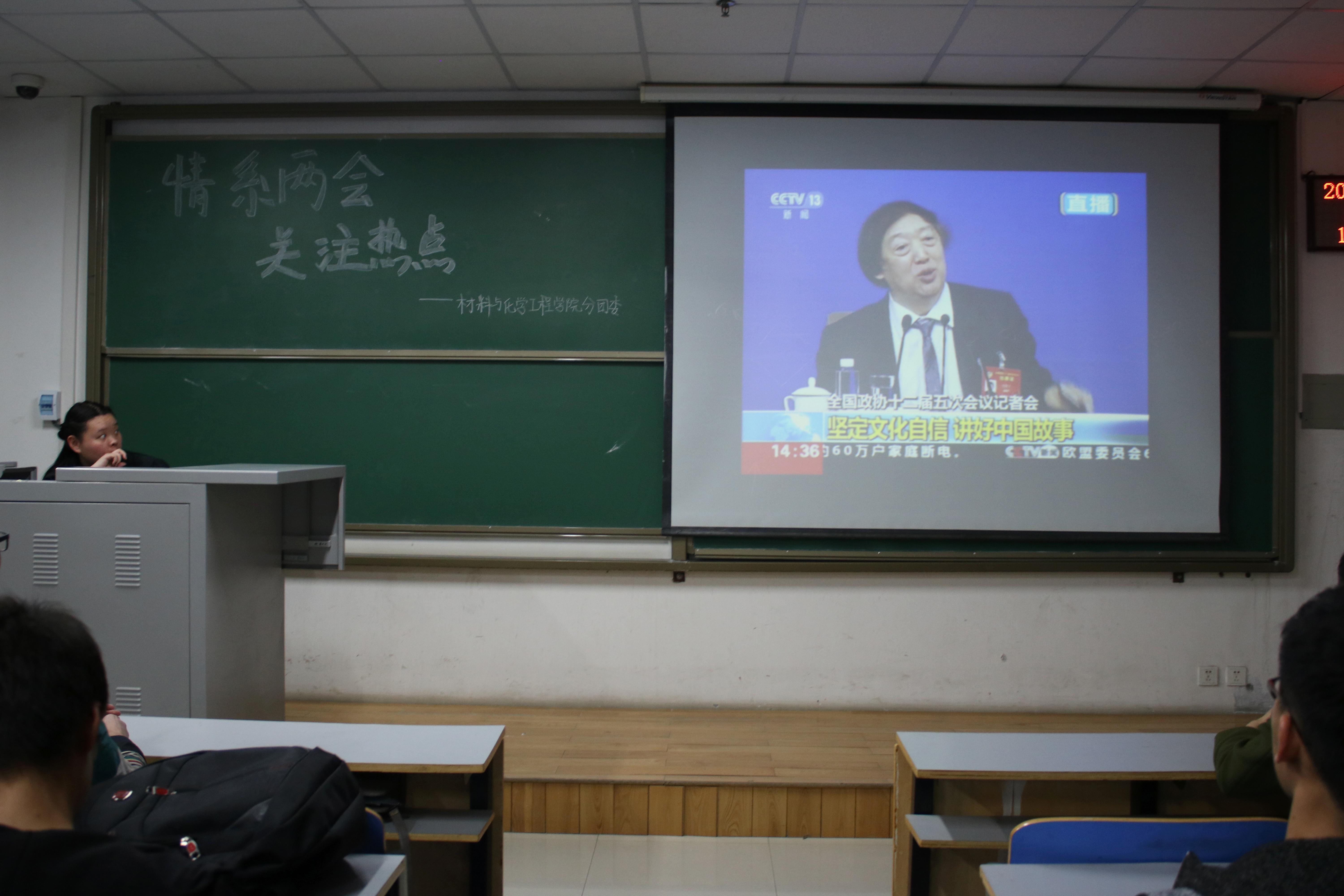 为了拓展大学生思想政治教育渠道,引导大学生将个人理想融入于国家民族的共同理想中,激发广大学生关注社会时政热点的热情,增强青年学生历史使命感和责任感,由材料与化学工程学院分团委主办的“情系两会,关注热点”两会视频展映于3月12日在二教楼808室拉开序幕。参加本次活动的人员包括16级全体学生代表、分团委、学生会成员。