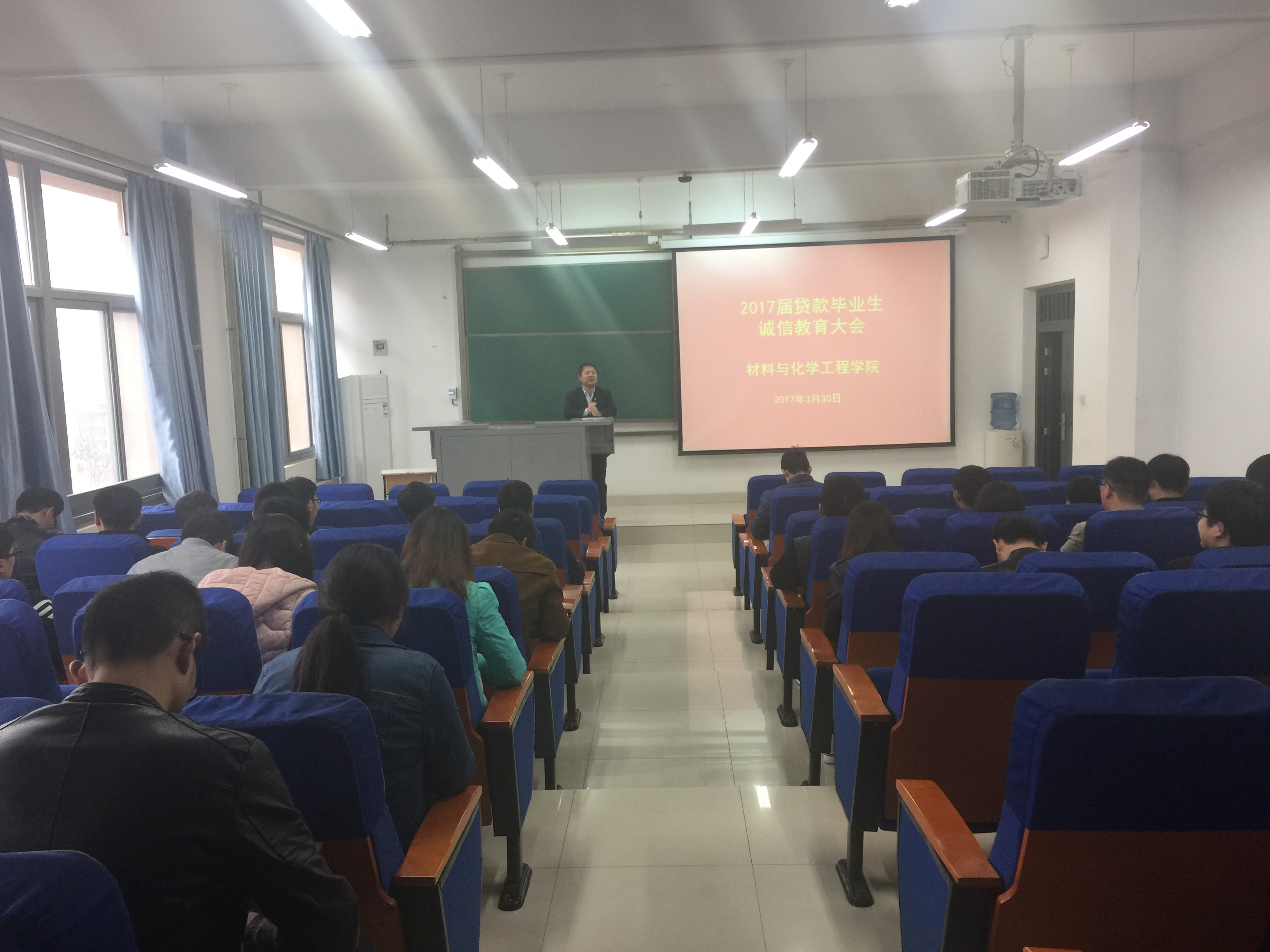 为了进一步做好国家助学贷款工作,增强学生诚信还贷意识和社会责任感,2017年3月30日下午16:00,材料与化学工程学院在化工楼218召开“2017届贷款毕业生诚信教育大会”,学院党总支副书记宋德涛老师、负责贷款的刘欣老师和全体贷款毕业生参加了此次大会。