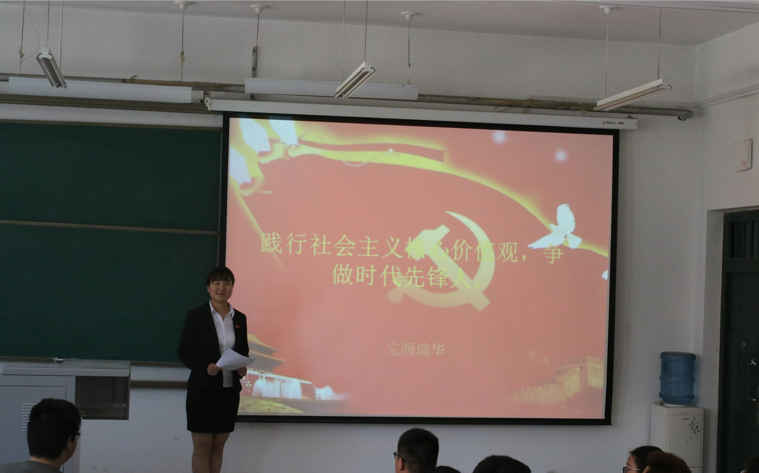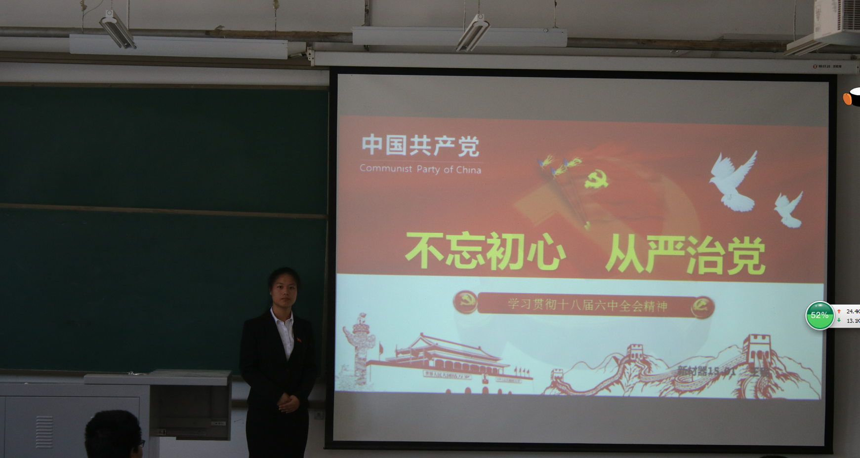 在演讲的过程中,党员们身着正装,佩戴党徽,意气风发,精气神十足!党员们都提前认真积极地准备了自己要讲的主题PPT课件,课件内容分门别类,主要有“社会主义核心价值观的发展与践行”、“中国梦”、“习近平总书记系列重要讲话精神”、“十八届六中全会”、“党章总纲”、“全面从严治党”等几个主题。每位党员的讲解条理清晰,引人入胜,吸引着大家专心地学习。同时,我院30名自愿参加本次活动的同学也收获满满,并表示自己一定会积极向党组织靠拢,向党员们学习,学习党课,提升自身素质。