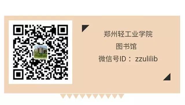 欢迎大家扫码关注郑州轻工业学院图书馆微信公众号,随时随地利用图书馆的丰富资源,了解图书馆的最新资讯动态,参与多彩的活动,享受方便快捷的服务。