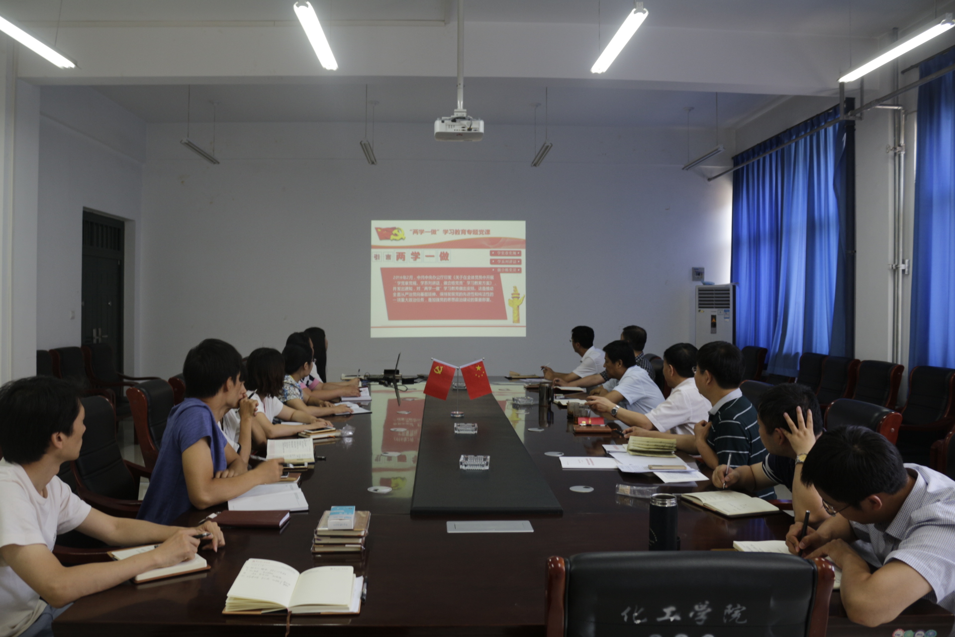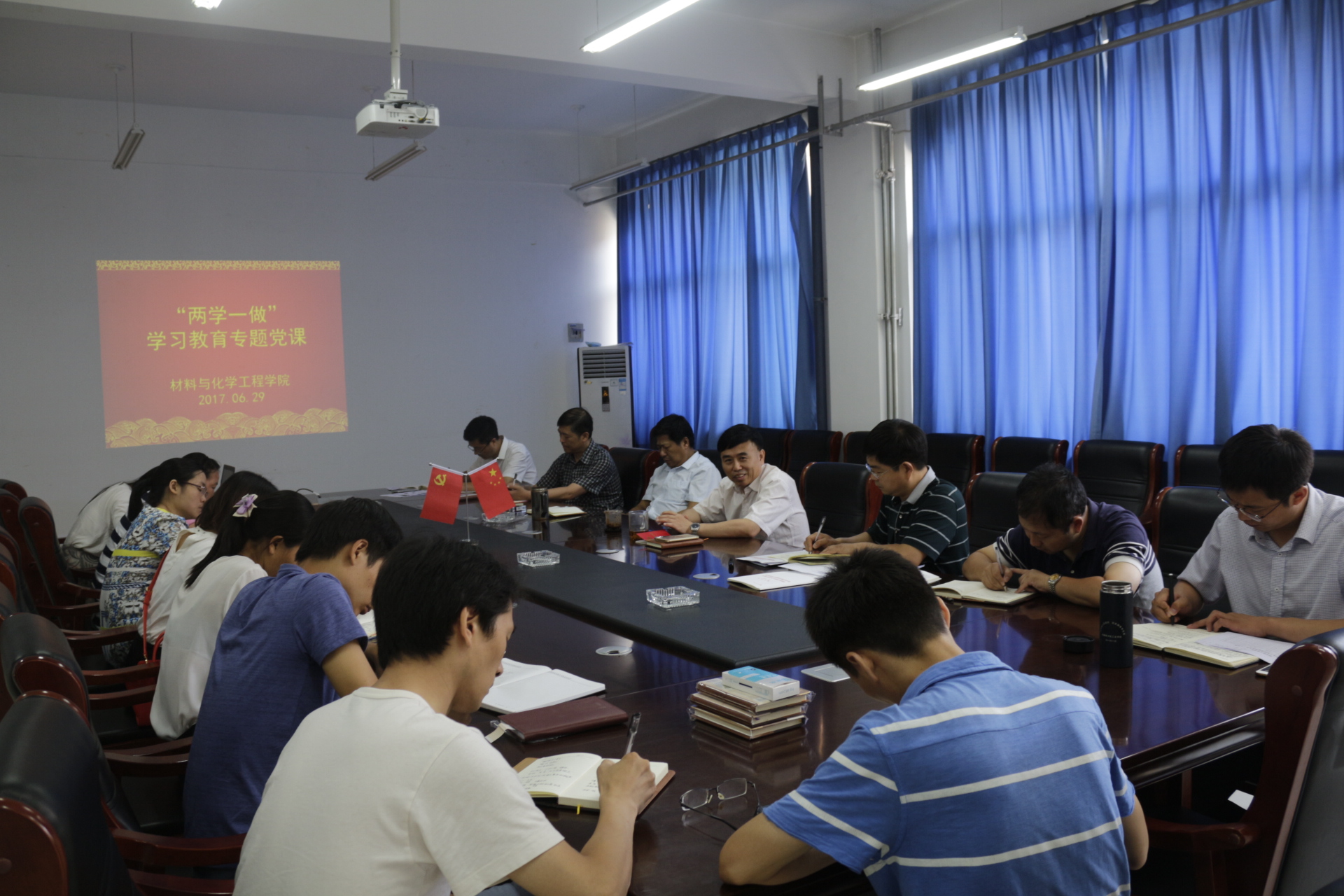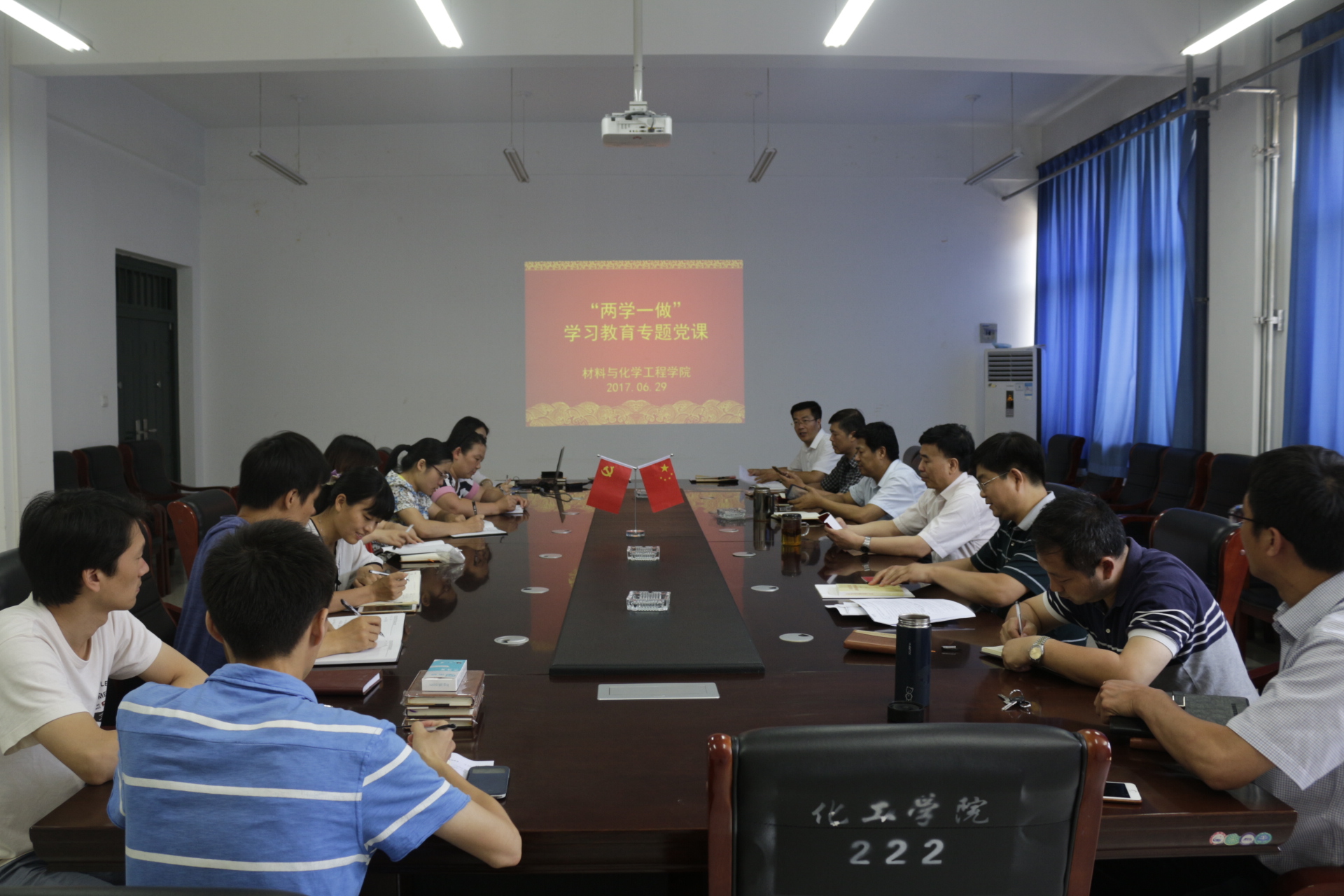在庆祝中国共产党成立96周年之际,为了深入学习贯彻习近平总书记系列重要讲话精神,推进“两学一做”学习教育常态化制度化。6月29日上午,材料与化学工程学院行政与重点实验室党支部在化工楼222会议室开展“两学一做”学习教育专题党课。活动由党支部书记彭东来同志主持,支部全体党员参加。方少明副校长应邀参加了支部活动。