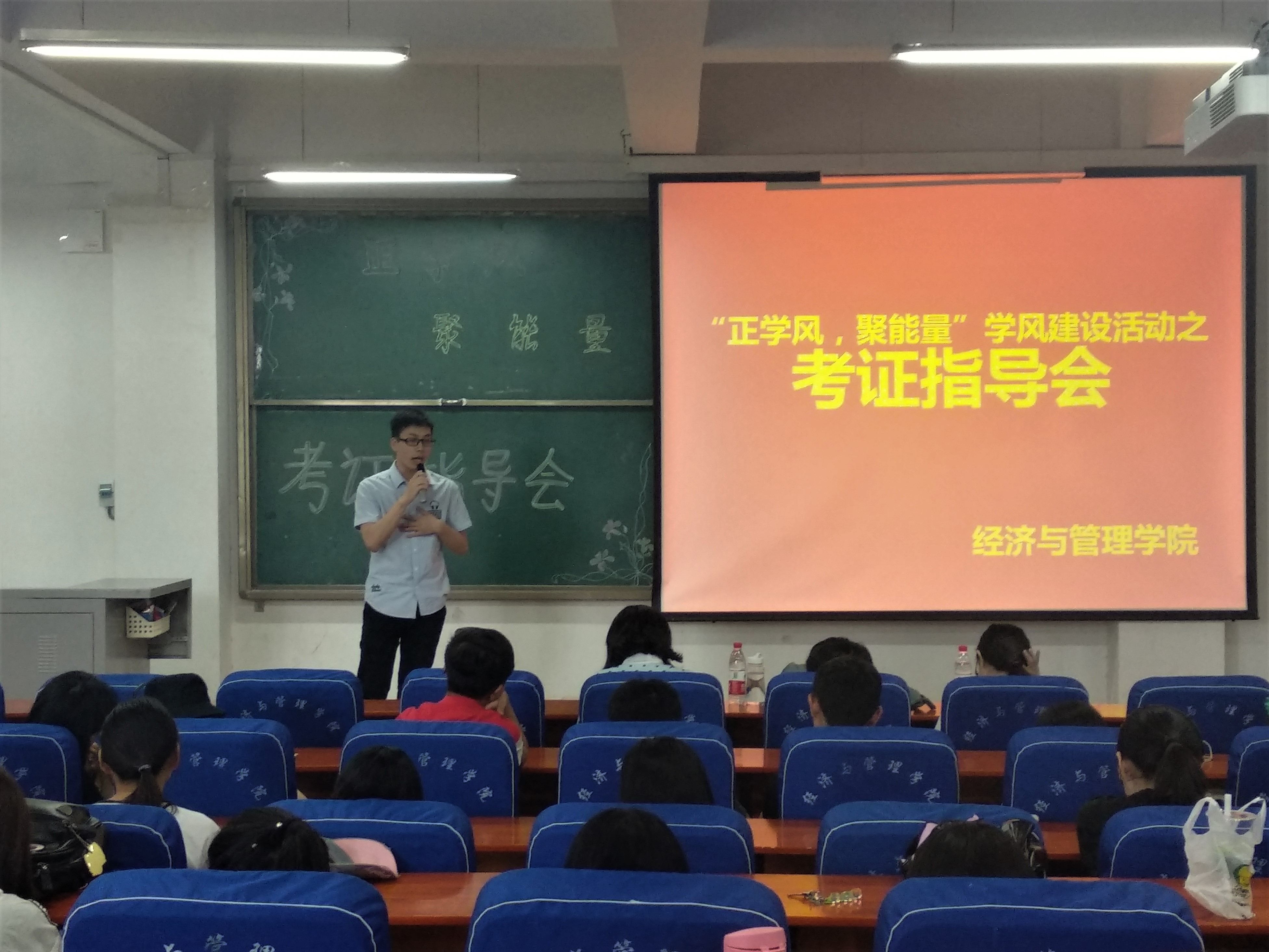 为进一步加强我院学风建设,提高同学们的考证热情和自主学习的积极性,帮助同学们明确考证目标和考证方法,经济与管理学院于2018年5月10日在经管楼211举办了以“正学风 聚能量”为主题的考证指导会,旨在让同学们立足自己的专业合理考证。
