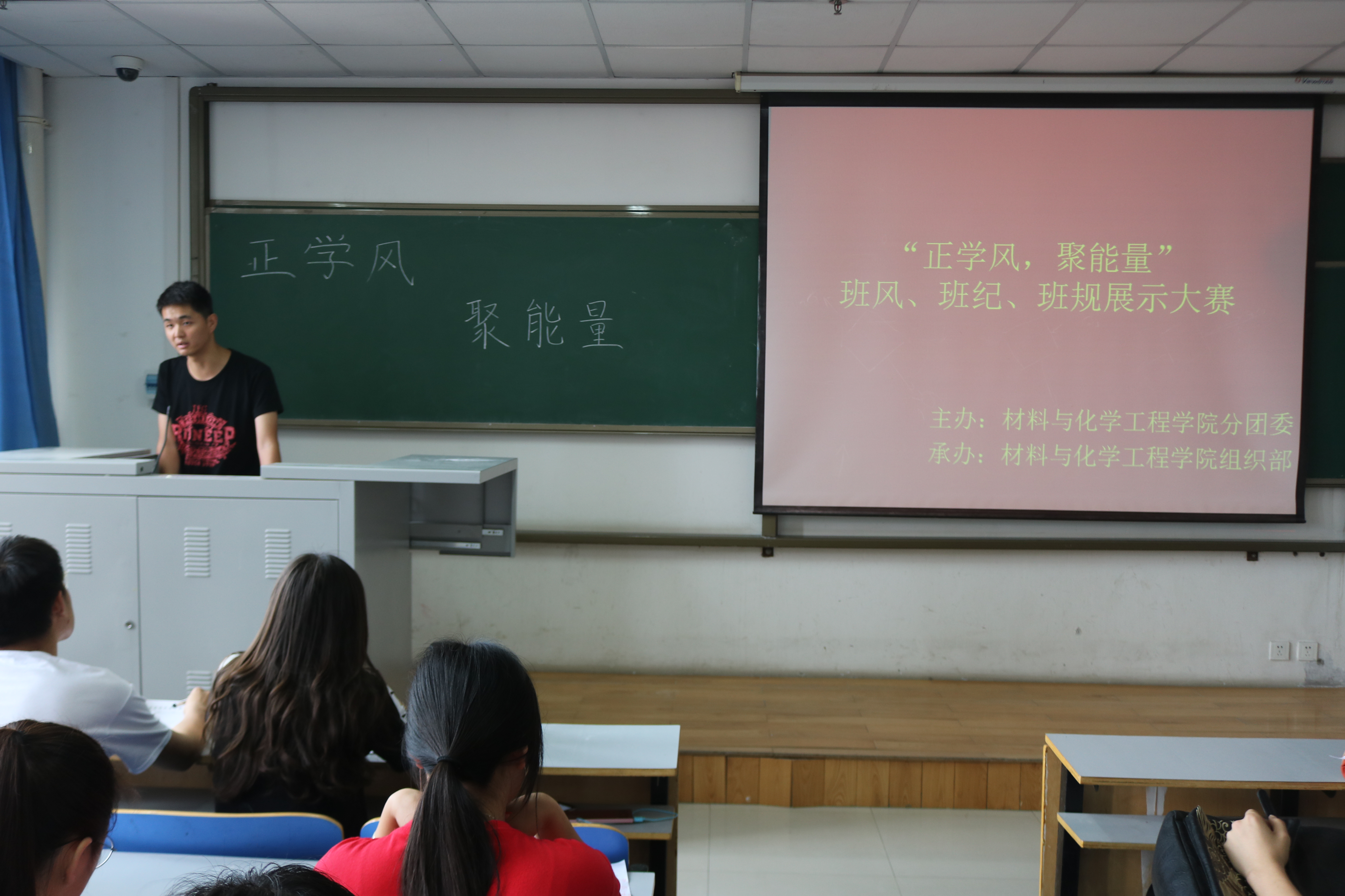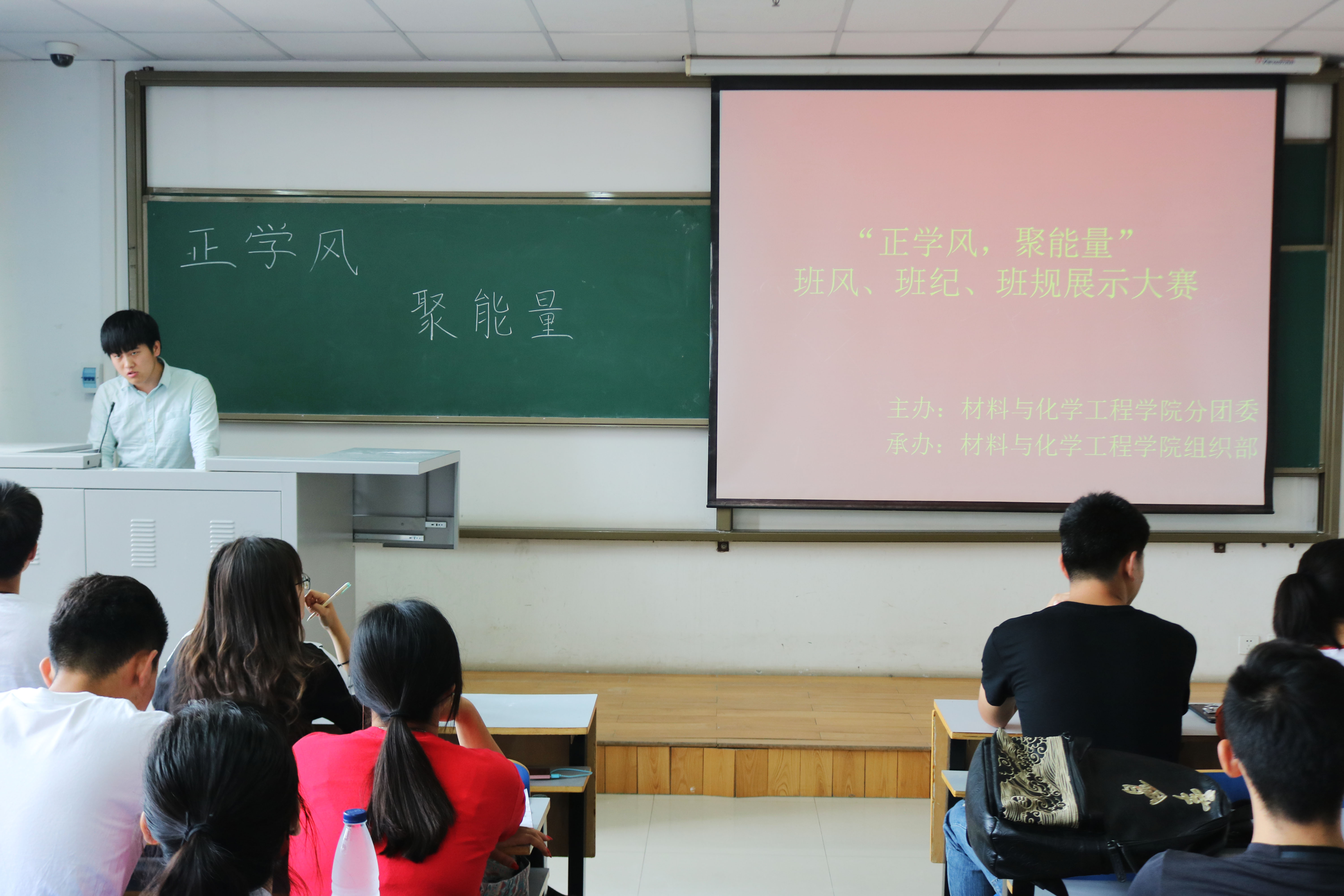 为了充分发挥和调动班级工作的积极性和创造性,加强各个班级之间的联系和沟通,由材料与化学工程学院分团委主办,学生会组织部承办的“班风建设PPT汇报展示”活动于2018年5月23日在二教楼808室举行。本次活动由组织部干事韩佳鑫主持,学生会全体干事、16级、17级各班班委参加了本次活动。