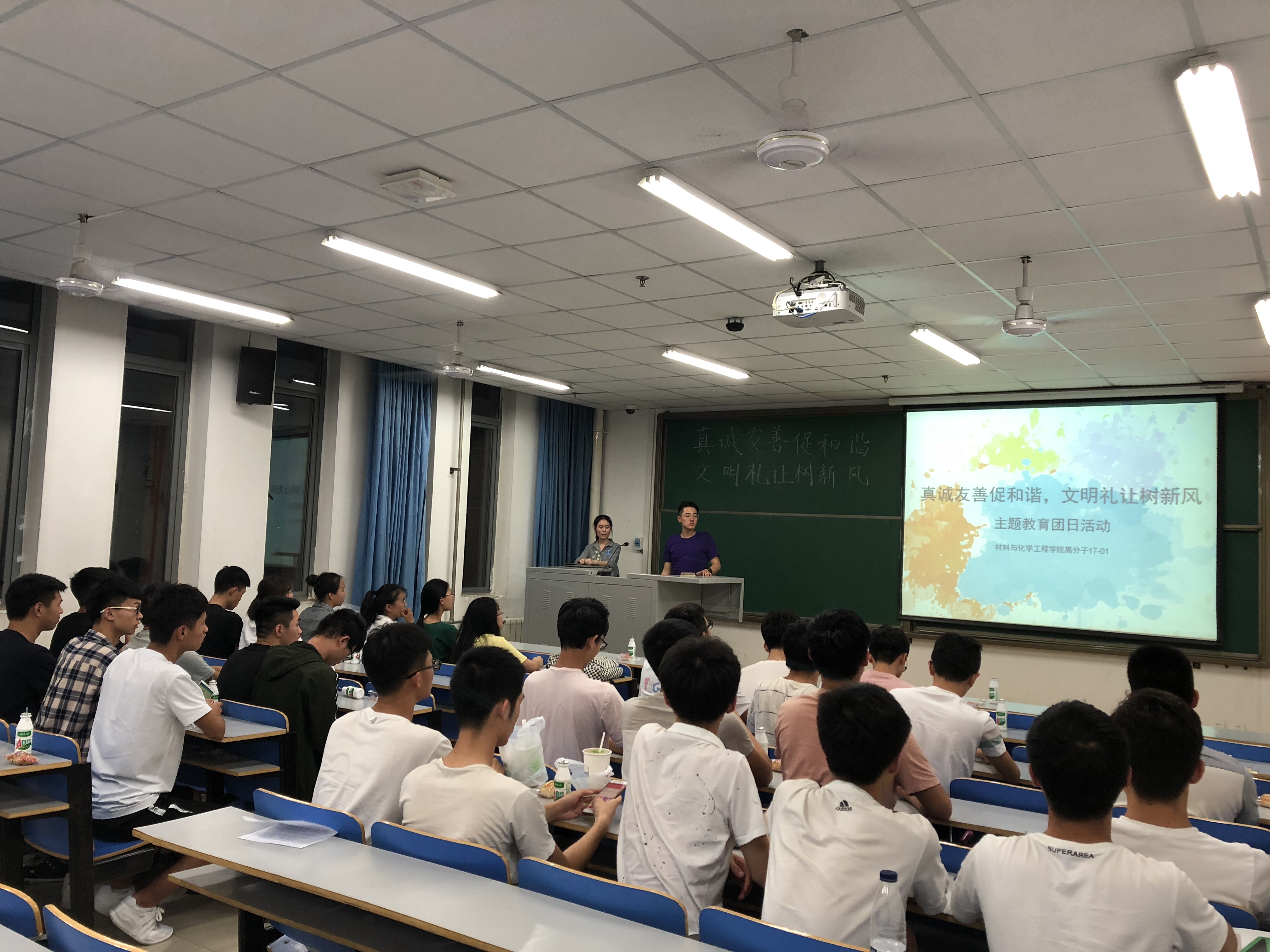 为促进同学们的情感交流,增强同学们真诚待人,友善处事的意识,推进和谐新班级,优良新班风建设,6月12日晚,由材料与化学工程学院举办的“真诚友善促和谐、文明礼让树新风”主题教育团日活动于二教楼808教室成功举办,分团委干事以及高分子材料与工程17-01班全体同学参加此次活动。