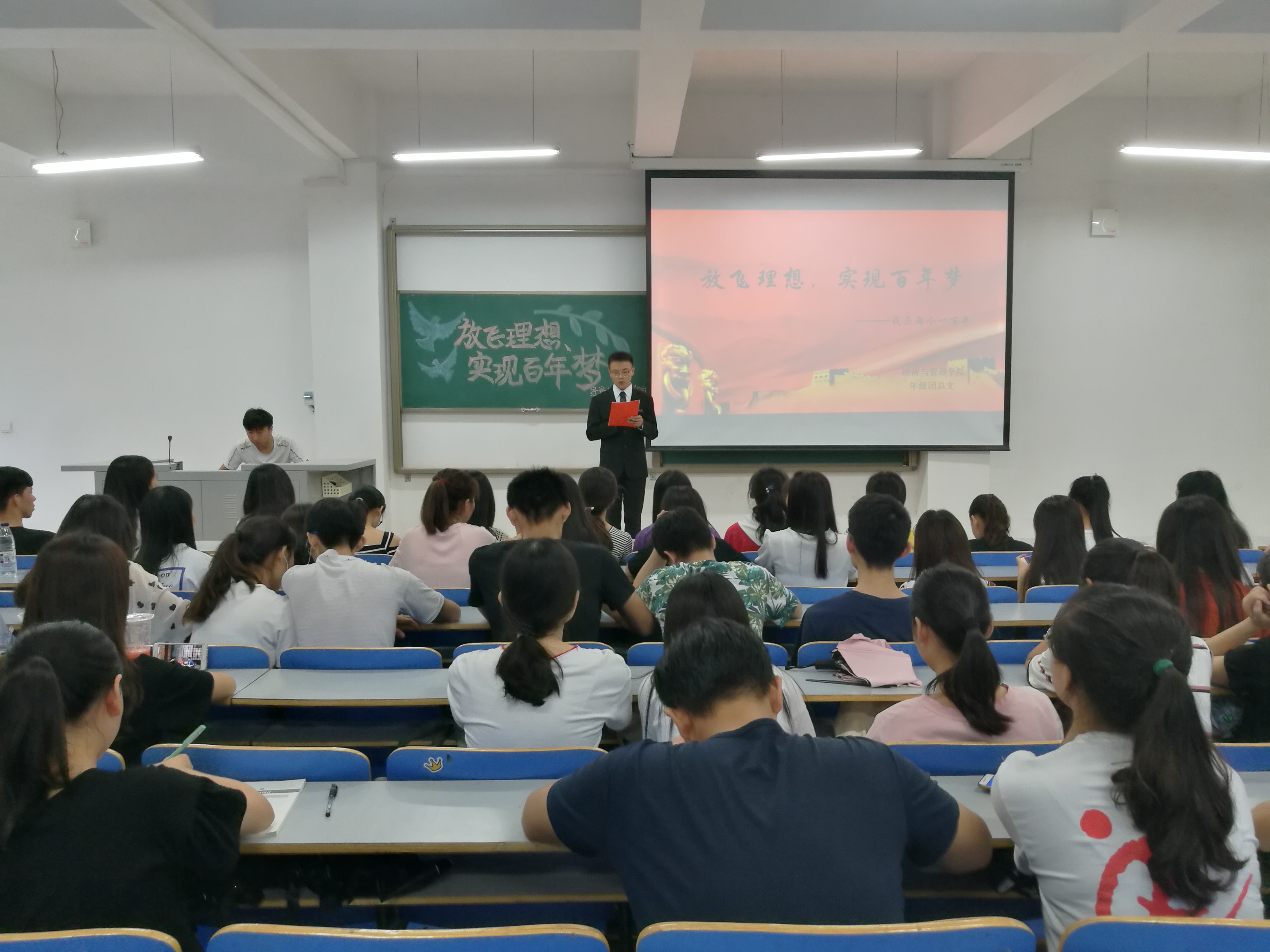 为深入贯彻习近平新时代中国特色社会主义思想和党的十九大精神,帮助我院学生深化认识、坚定信念。经济与管理学院于6月22日12:30在经管楼309举办以“放飞理想,实现百年梦”为主题的素质提升活动。我院100余名学生代表参加了此次活动。