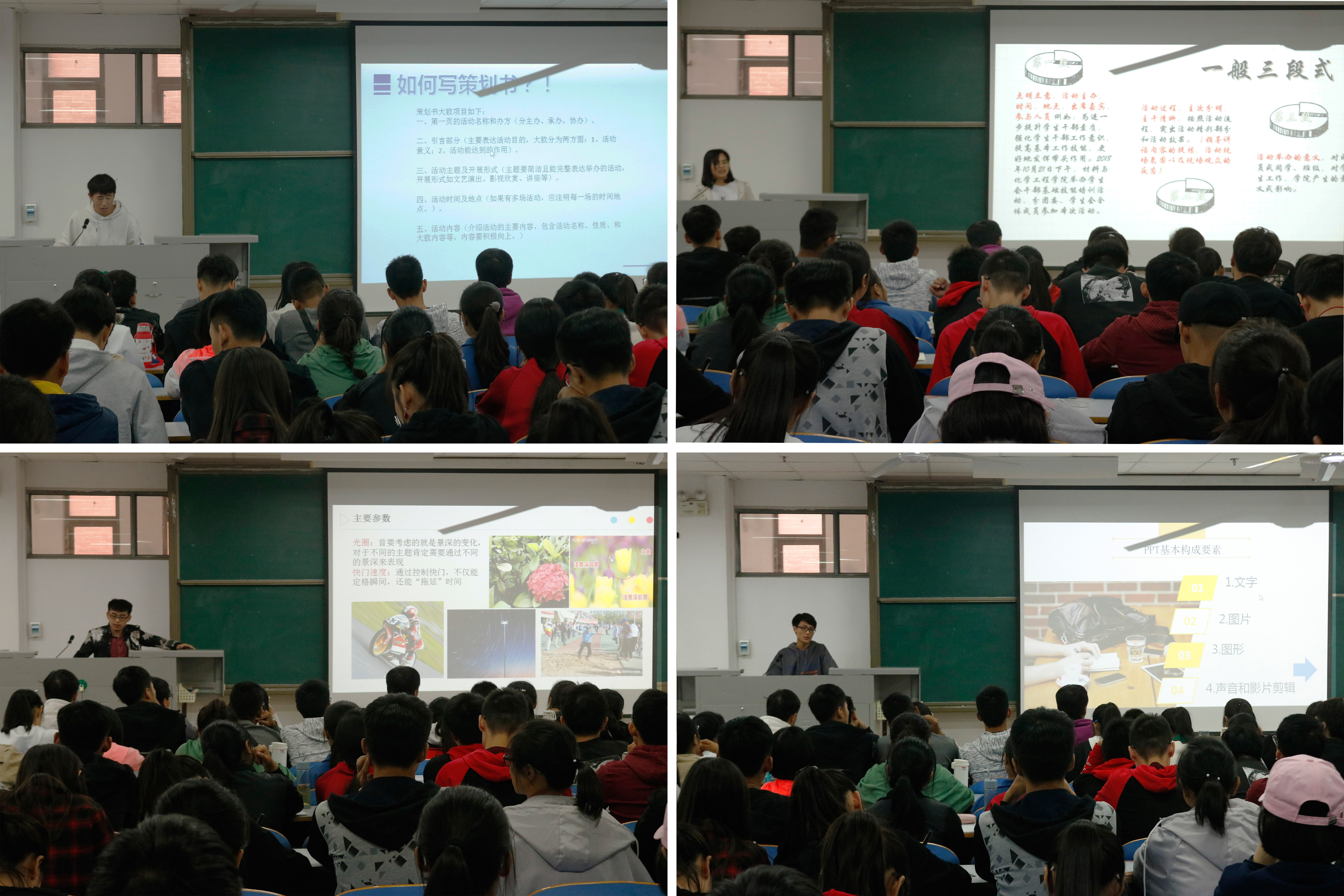 活动组织部部长陈虎进行了策划书的培训,他结合策划案例,就活动流程、预算、可行性分析等方面详细讲解了如何写出一份优秀策划。新媒体中心部长肖志华则从摄影的概念、单反相机的工作原理、相机各项参数等方面对同学们进行了摄影理论知识的普及,还讲解了摄影构图及一些极具实用性的摄影技巧。新媒体中心部长王举通过简洁明了的ppt向大家展示了制作ppt的基本内容,并对我们常用的PPT类型展开了细致而又耐心讲解,他通过基本操作、图形绘制以及动画操作等方面进行了教学演示。新媒体中心部长嵇玉寅从新闻稿的特点、新闻稿的写作方法和新闻稿的注意事项等内容切入,为同学们详细讲解了新闻写作的基本要素、新闻写作易出现的问题以及如何写好新闻稿等问题,在培训期间,同学们认真听讲,并做好笔记。之后,同学们纷纷表示收获满满,此次活动取得了圆满成功.