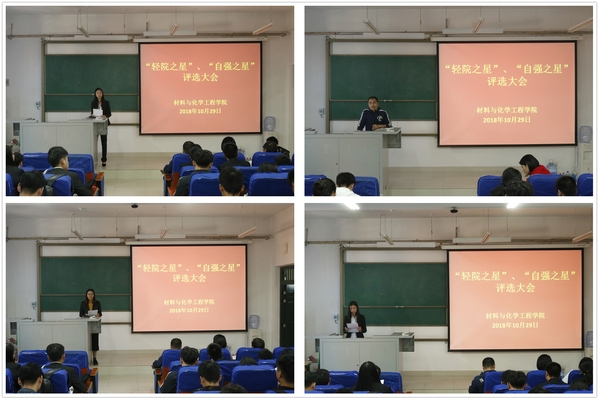 为进一步培养“勤奋、向上、求知、笃行”的学风,展现我院学生积极向上的精神面貌和全面发展的综合素质,加强我院学生思想政治教育,发挥先进典型的示范引领作用,2018年10月29日中午,材料与化学工程学院于化工楼218举行十佳“轻院之星”、十佳“自强之星”评选大会。学院全体辅导员老师、各班级学生代表参加了本次大会。