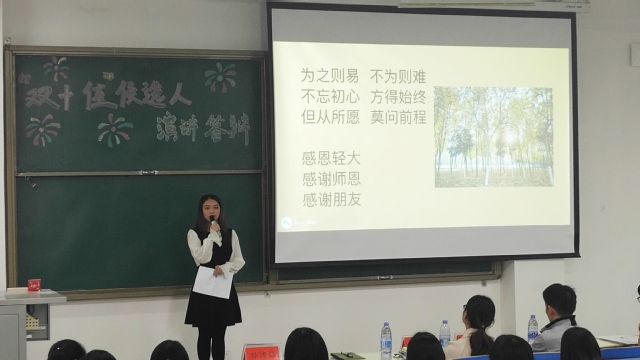 大会伊始,主持人首先向大家介绍了评选办法和比赛流程,同时也强调了双十佳评选活动的意义,并希望同学们能够借助本次评选,检验自己的大学学习生活成果,从而树立良好的学习目标,全面培养提升个人素质。随后,各候选人结合PPT展示,通过个人演讲的形式将自己在大学生活中的所得所感分享给大家。他们当中有始终“孜孜不倦,誓要学出一片星空”的学霸;有坚持“但从所愿,莫问前程”热心家乡公益活动的学生干部;有不惧家庭困苦,坚信“自强不息的女生最好命”的阳光少女;有敢于“迎难而上,在逆境中努力提升自我”的励志少年。候选学生生动形象的演讲引起台下学生的共鸣,掌声接连不断。