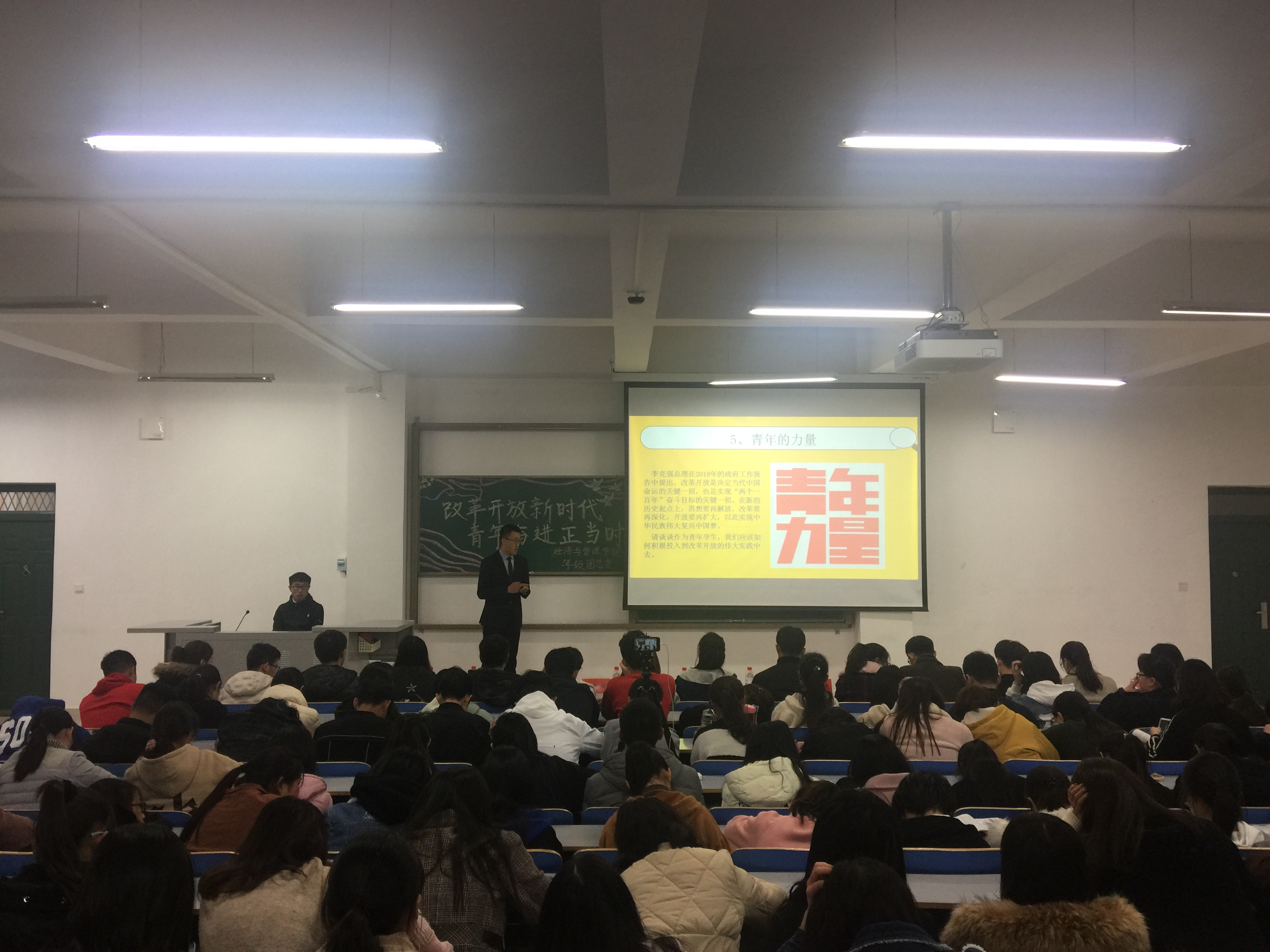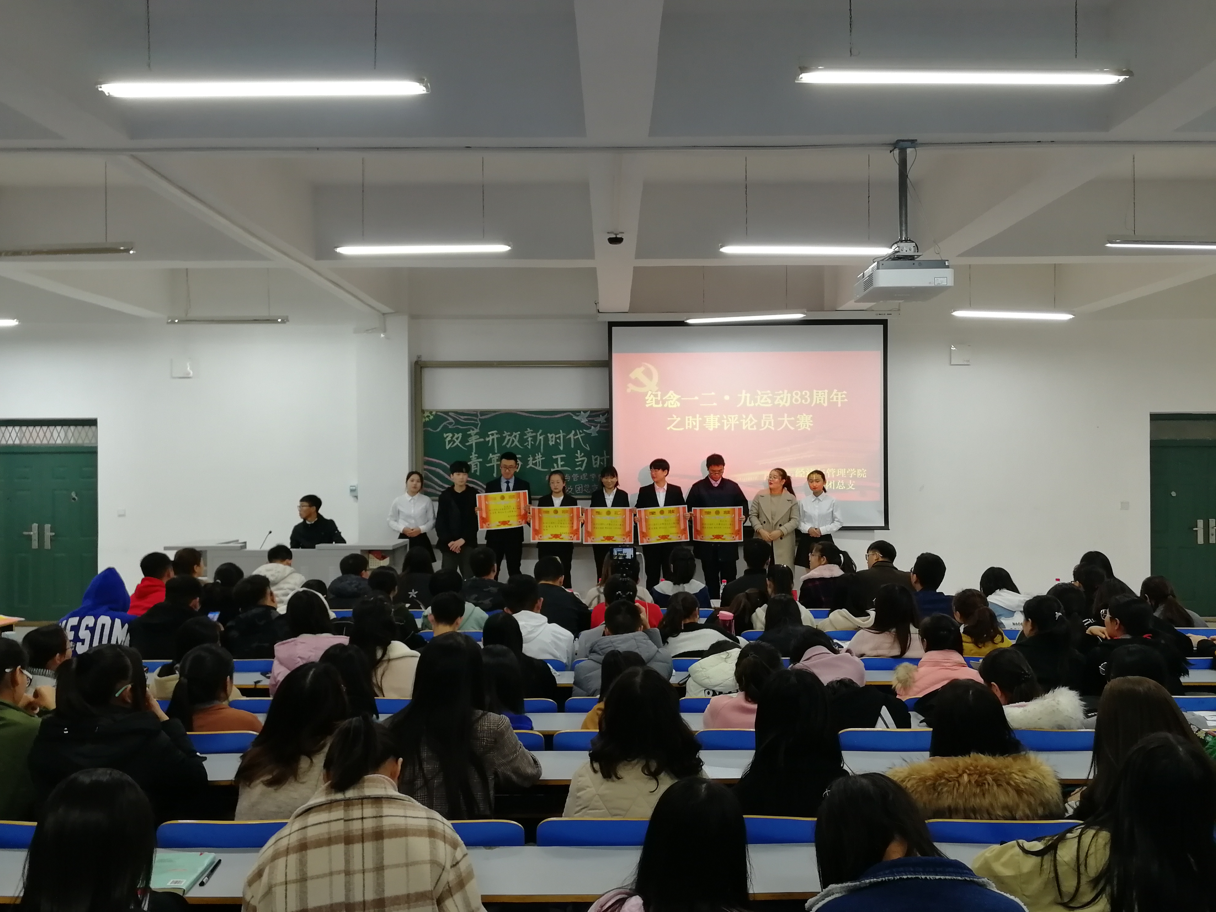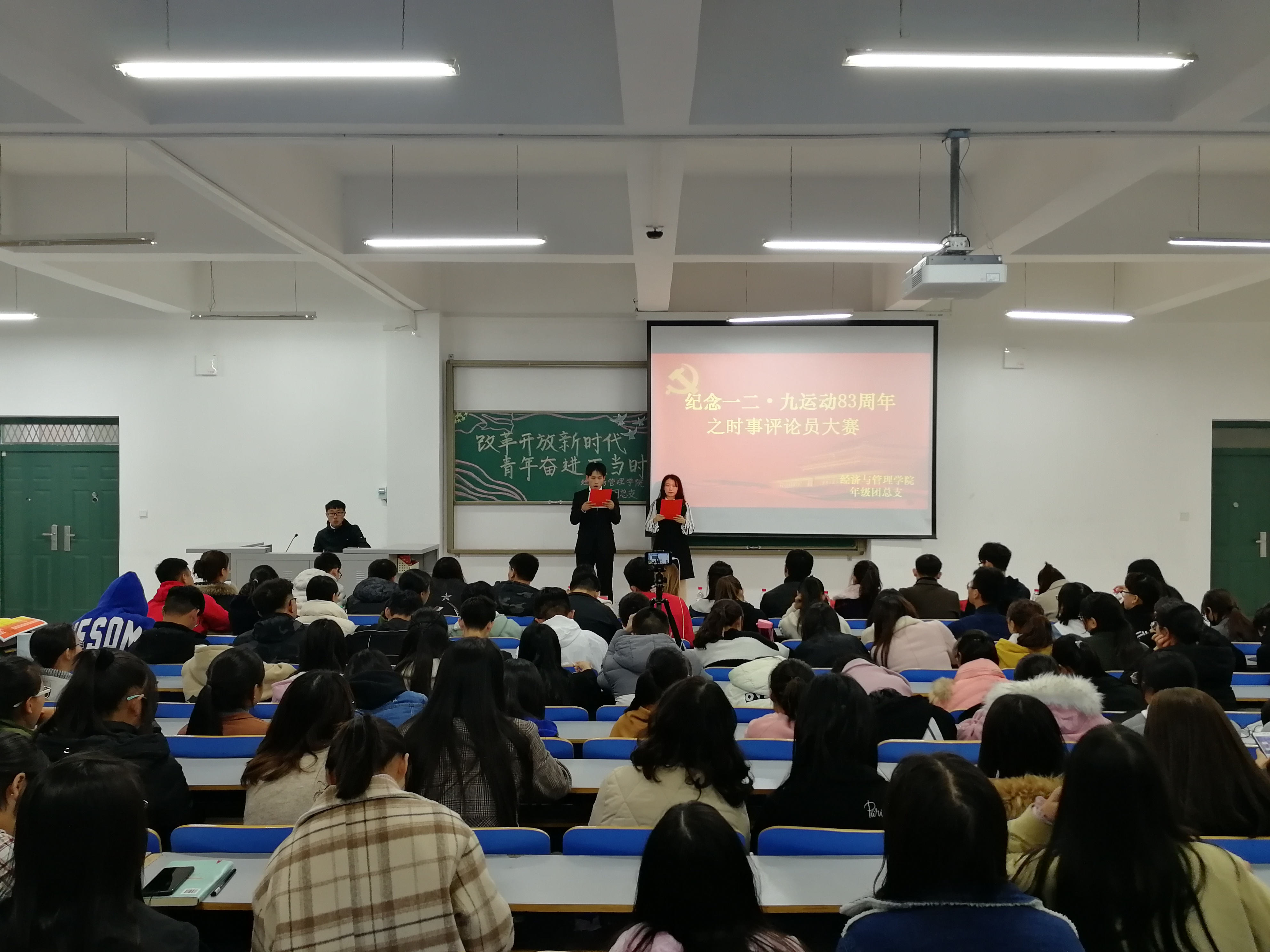 为了培育大学生爱国精神,正确理解社会主义核心价值观,增强我院大学生对时事政治的把握能力。2018年11月16日中午12:00,经济与管理学院在经管楼309举办了以“改革开放新时代,青年奋进正当时”为主题的纪念一二·九爱国运动83周年系列活动之改革开放40周年时事评论员大赛。18级各班班级代表参加了此次活动。