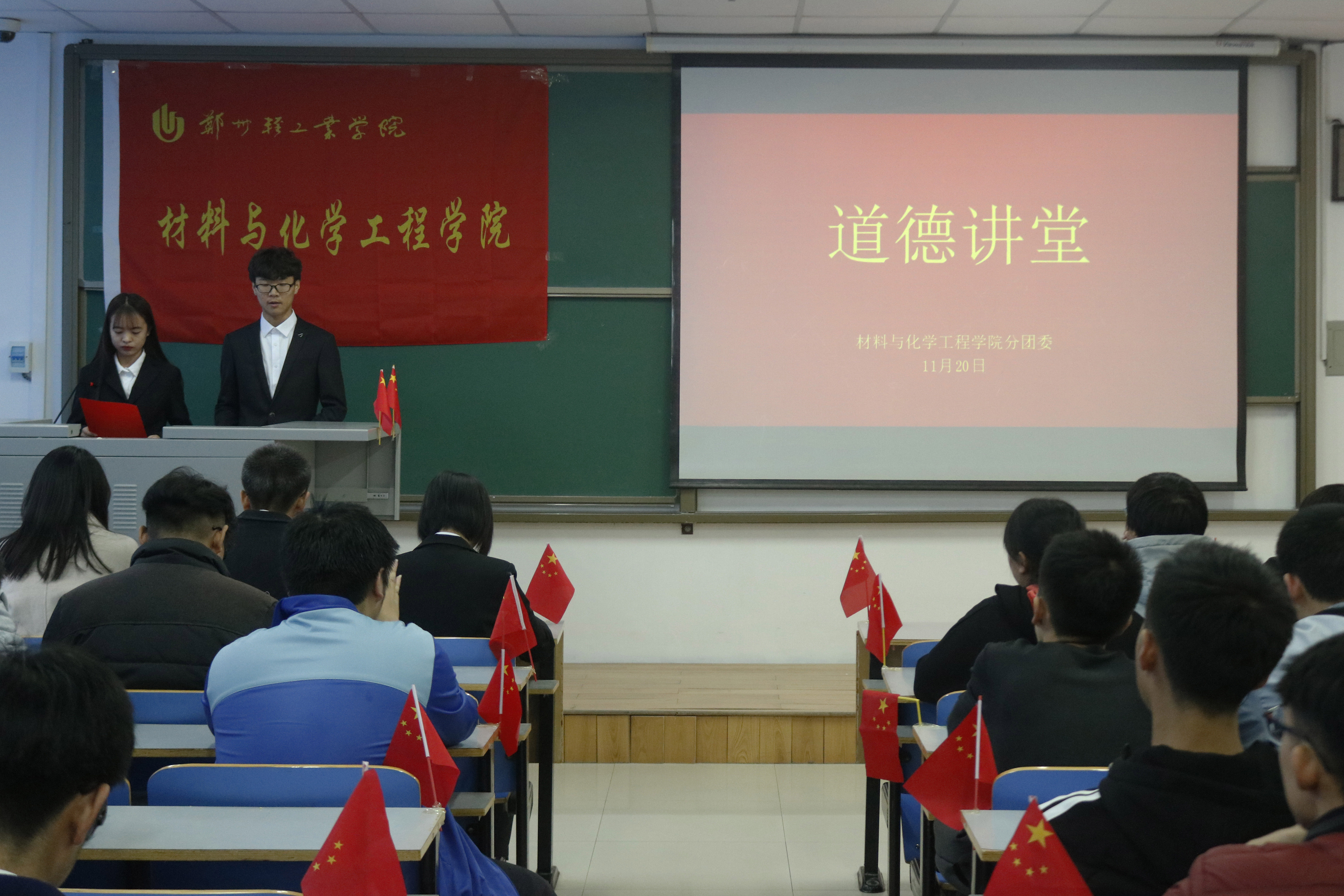 为弘扬中华民族的传统美德、传递正能量、共建和谐校园,11月20日中午,由材料与化学工程学院分团委、学生会举办的以“引领道德新风尚,传递青春正能量”为主题的道德讲堂于科学校区二教楼804室隆重举行。学院部分学生干部及17、18级优秀学生代表参加了本次活动。