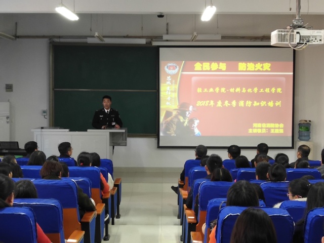 为进一步提高材料与化学工程学院全体师生防火、防灾的安全意识,预防和消除各种火险隐患,扎实做好今冬明春的火灾防控工作,进一步贯彻落实《郑州轻工业学院今冬明春火灾防控工作方案》(郑轻院【2018】52号)的通知精神,巩固学院消防安全形势,确保学院平安、稳定和各项工作顺利进行。2018年11月23日下午,我院特邀河南省消防协会王胜强教员在材化楼218房间举行了消防安全知识讲座,学院领导和全体教师参加了此次活动。