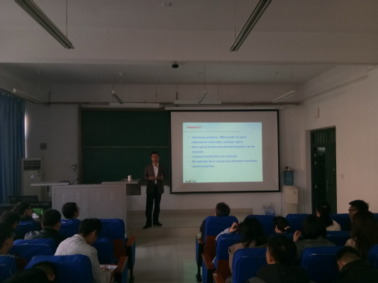 张浩力教授首先介绍了石墨烯、过渡金属硫族化合物、黑磷等多种二维纳米材料的溶液法合成及光电材料应用,对其在固体条件下各种光学性质进行了系统的介绍,并深入浅出的介绍了课题组目前研究的工作内容及取得的一系列成果。互动环节中,张浩力教授与师生提出的问题进行了深入的讨论和交流,使大家丰富了学术知识、扩宽了领域视野,启发了科研思路,为以后的科研发展打下深远而坚实的基础。