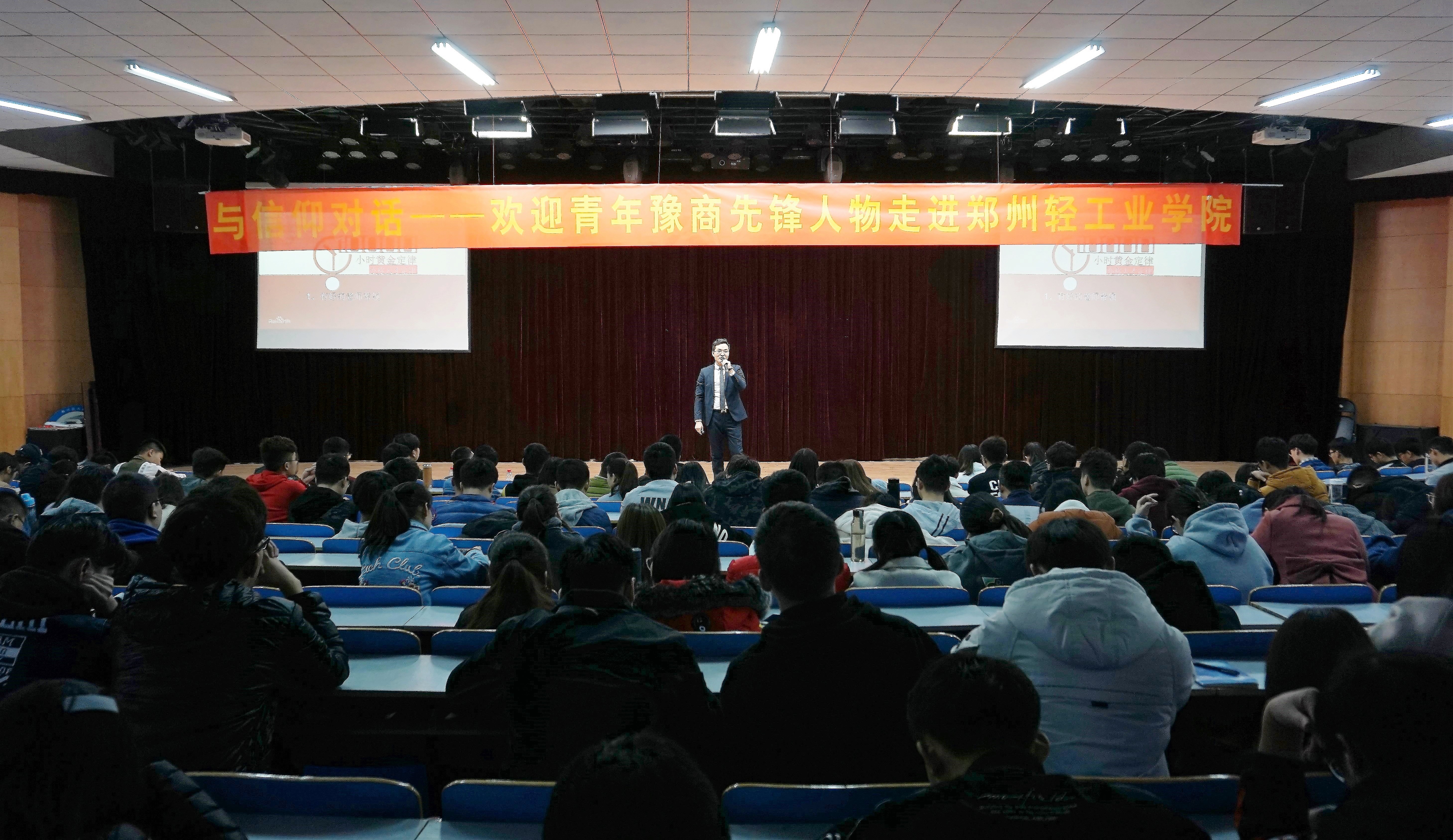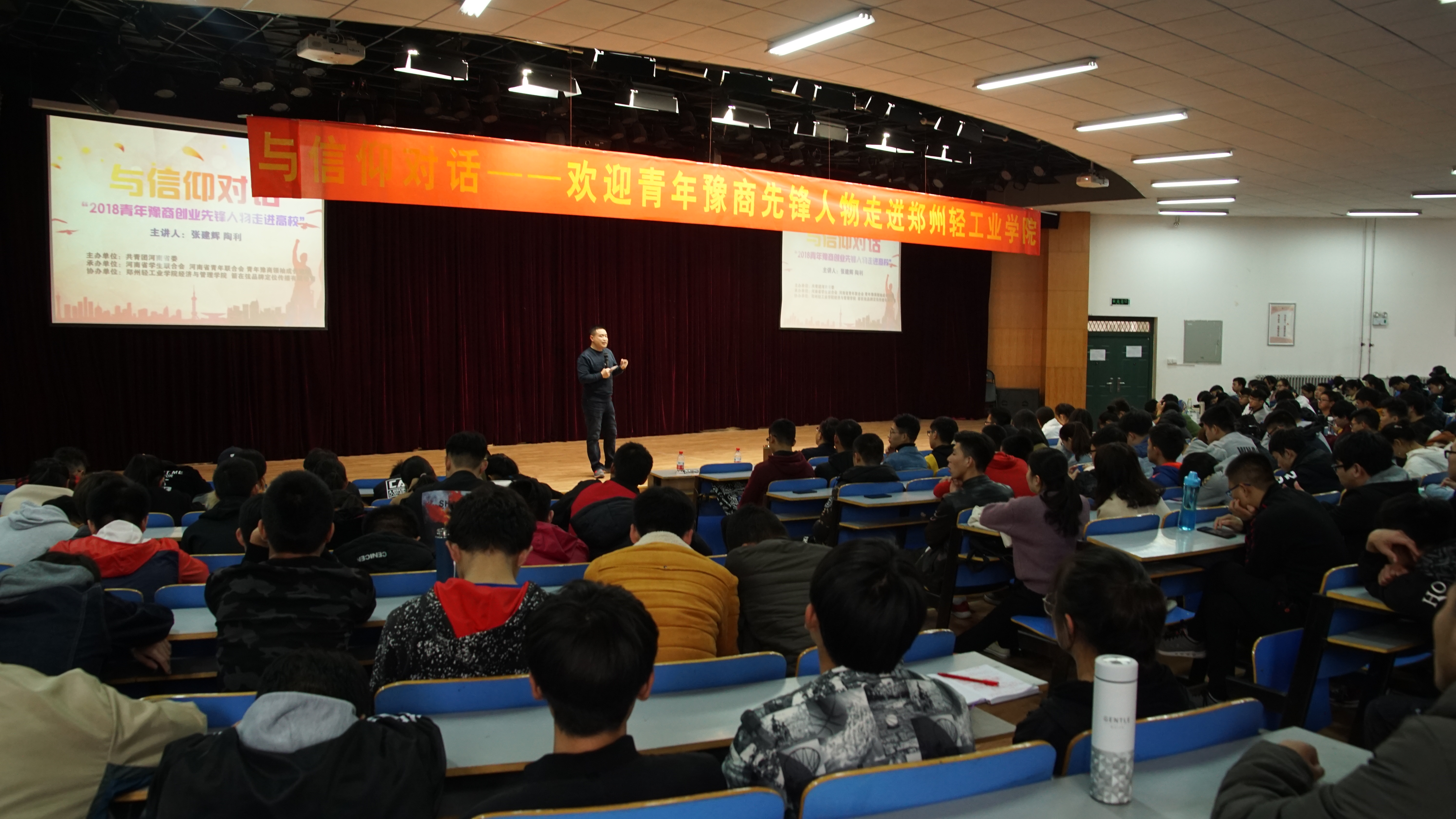 11月27日下午2点30分,“与信仰对话——2018青年豫商先锋人物走进郑州轻工业学院”专场报告在我校科学校区活动中心208隆重举行。河南省水茫茫饮品有限公司总经理张建辉、河南省亿恩科技股份有限公司董事长陶利,两位豫商杰出代表,为现场四百余位轻院师生分享了他们精彩的创业故事。