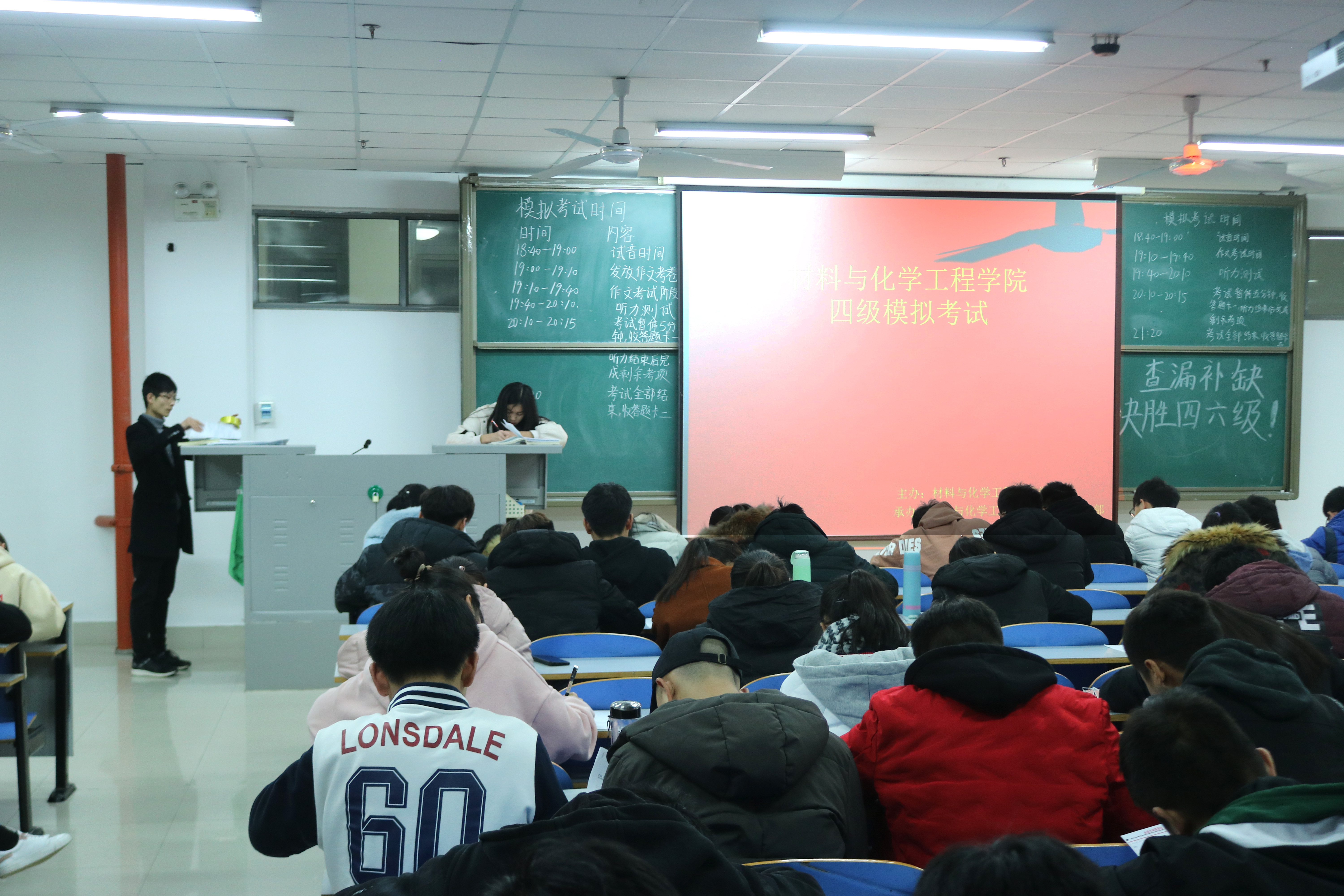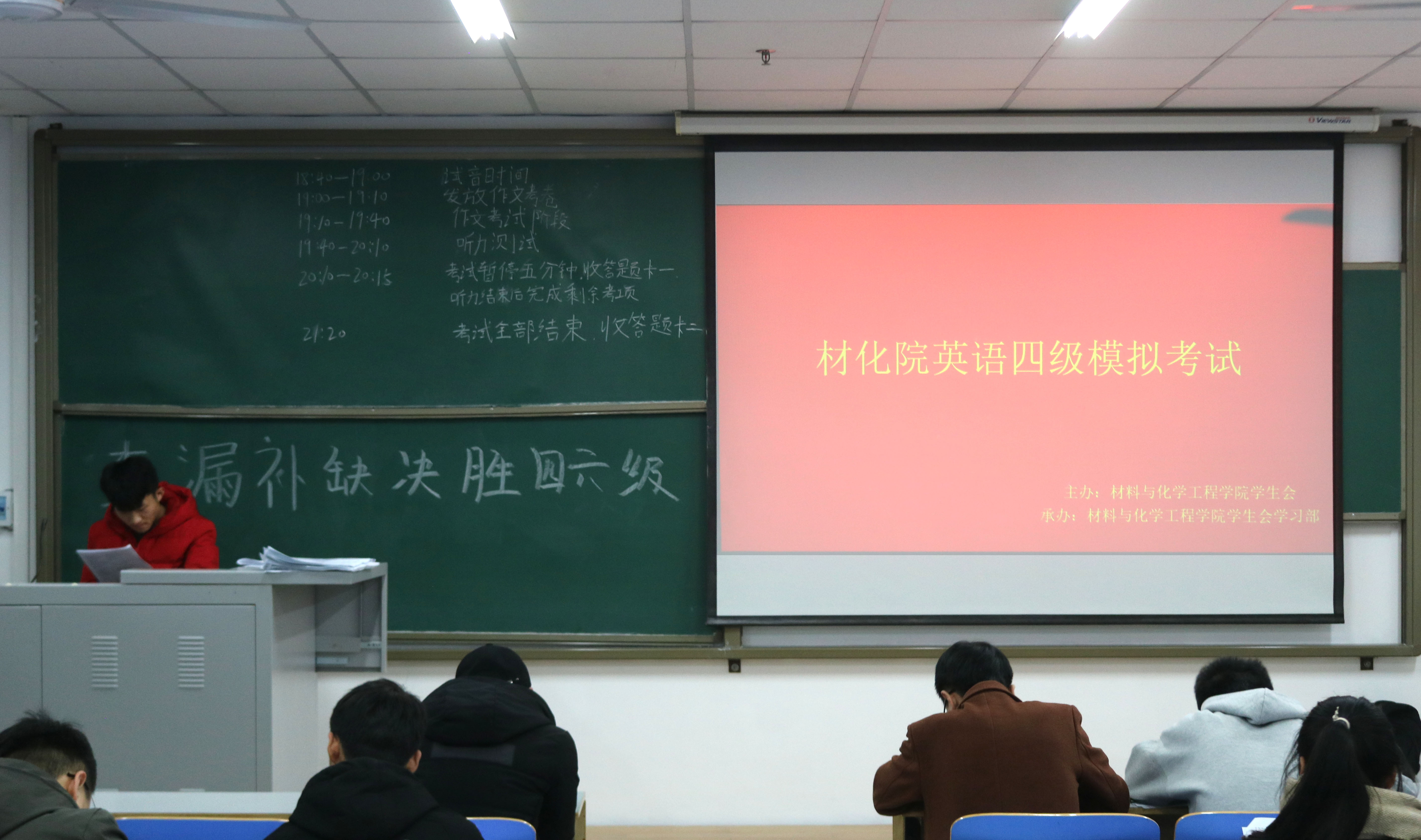 模拟考试于晚上七点准时开始,考试流程严格按照全国大学英语四六级考试模式进行,希望通过此次模拟考试,同学们能够在正式考试中合理安排时间,发挥出最高水平。考试过程中,同学们态度端正,诚实守信,严格遵守考场纪律,考场氛围紧张而又有序。答题过程中,同学们时而停笔仰面沉思、时而奋笔疾书。从写作到翻译,每一道题目都被同学们认真地对待。考试结束后,同学们有条不紊地离开考场,然后由学生会学习部干事统一批改答题卡并统计分数,后期将通过材化学习墙公布考试成绩,并对成绩优异的同学发放奖励。事后学习部干事将多余试卷发放给未能到场的学生,真正做到物尽其用,惠及全体。本次模拟考试圆满结束。